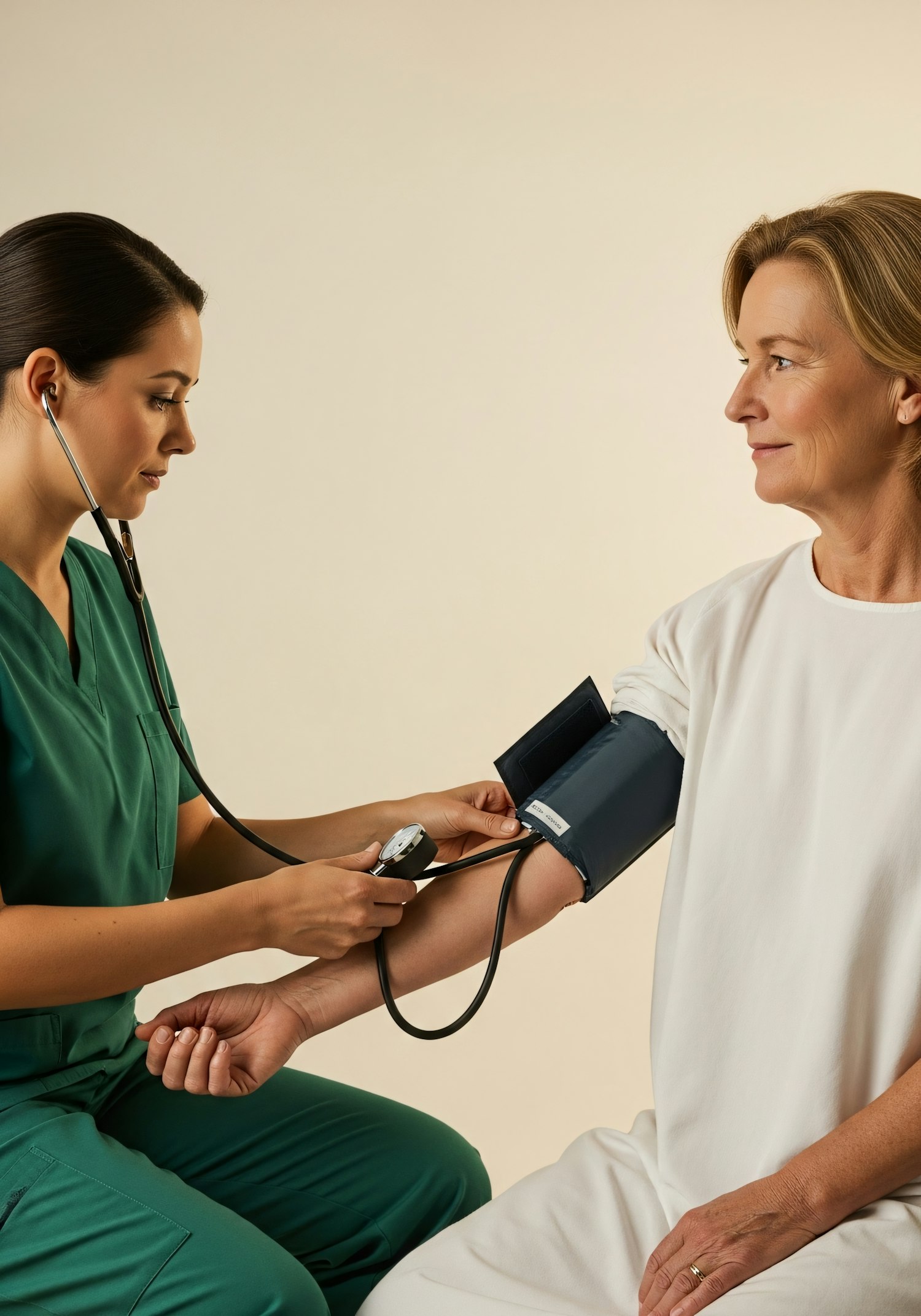 A healthcare worker in green scrubs measures a patient's blood pressure using a cuff and stethoscope in a neutral setting.