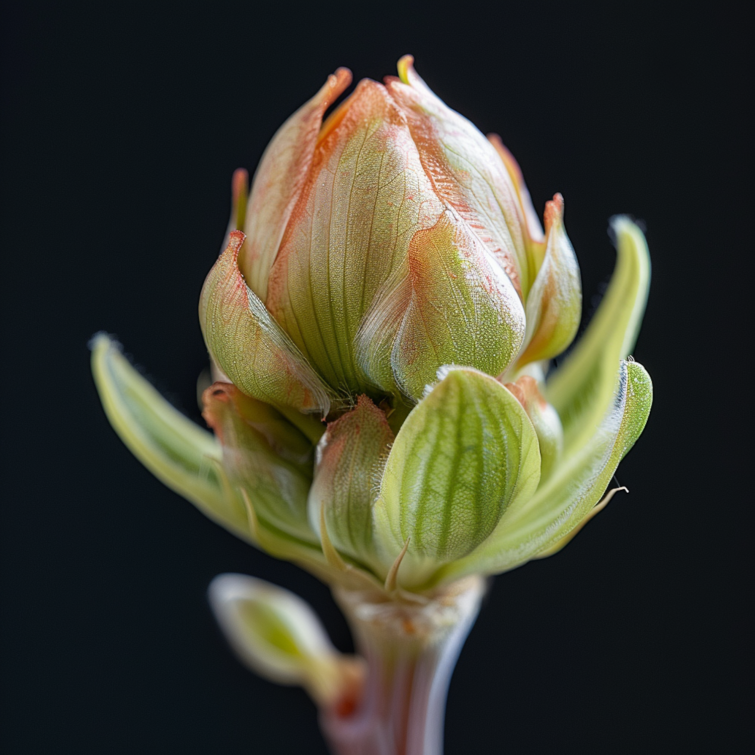 Close-up of a flower bud with green and orange hues against a dark background, highlighting its delicate texture and vibrant colors.