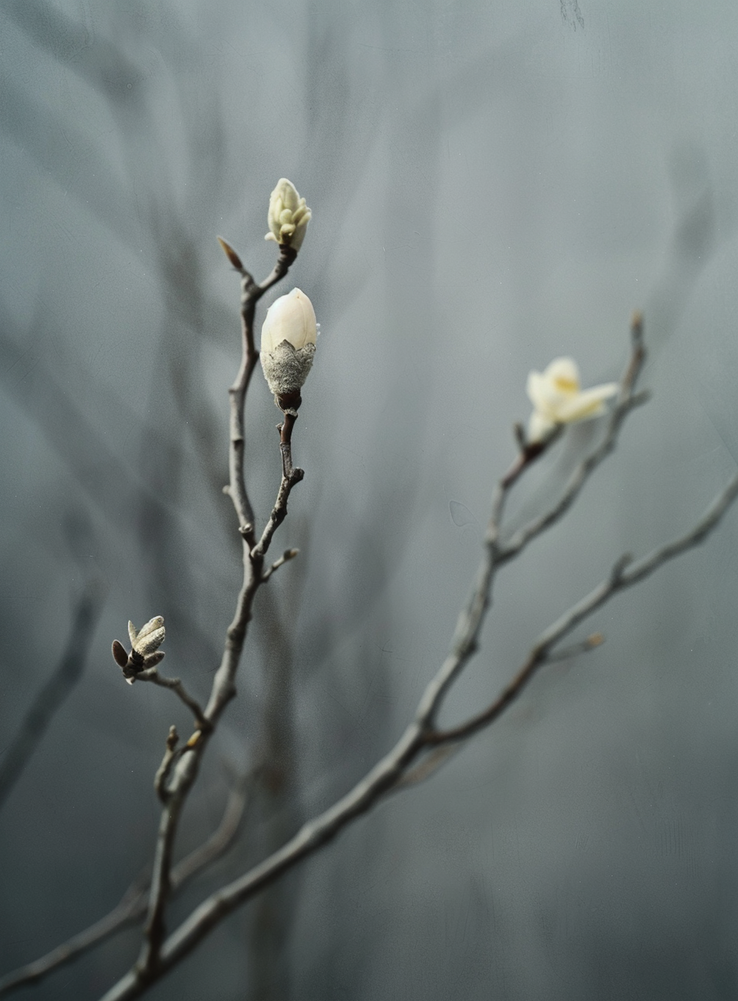 Delicate budding branches with pale cream buds against a soft, muted background, creating a serene and tranquil atmosphere.