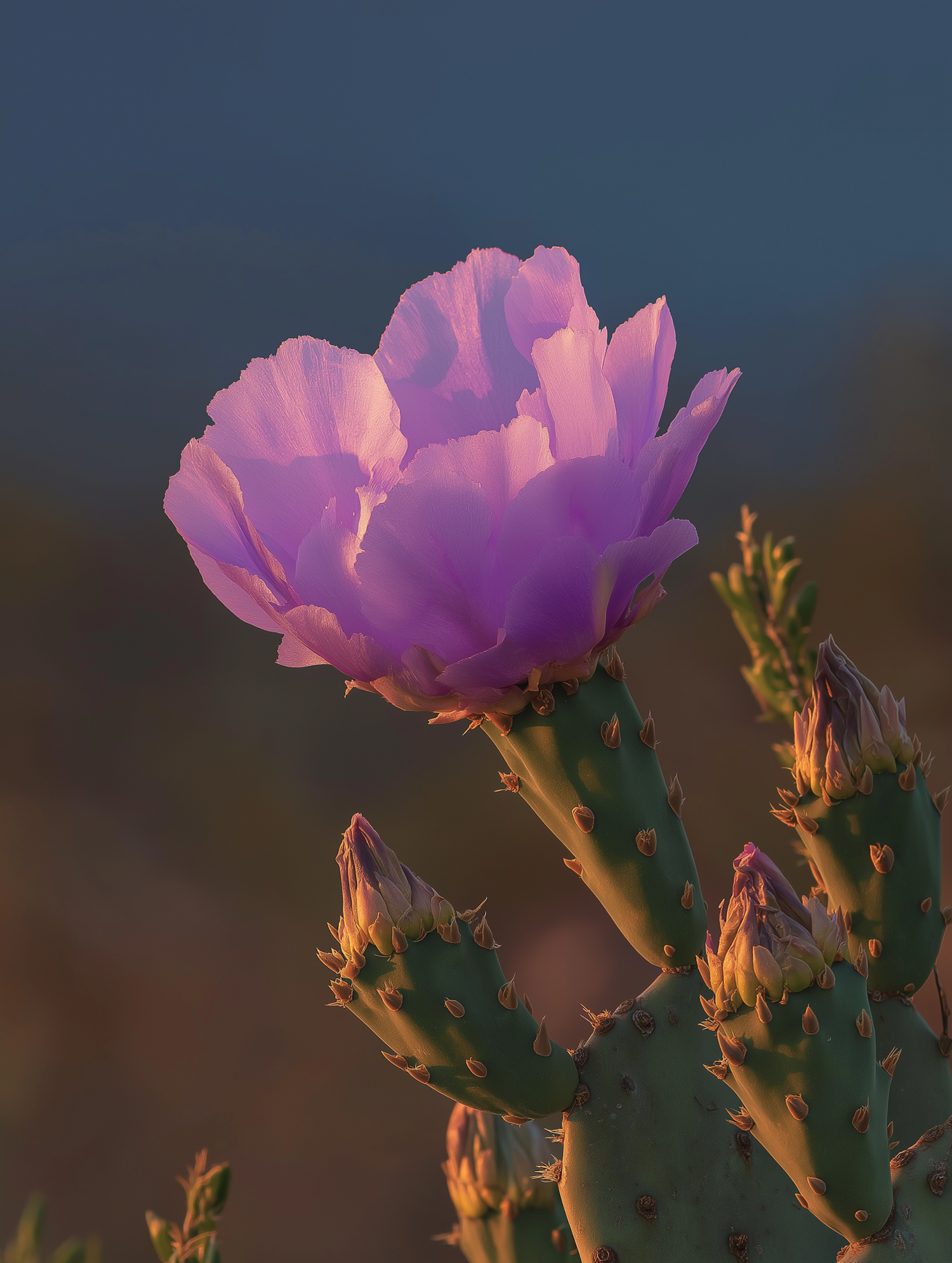 A beautiful purple flowering cactus with intricate petals and lush green pads capturing serene beauty.