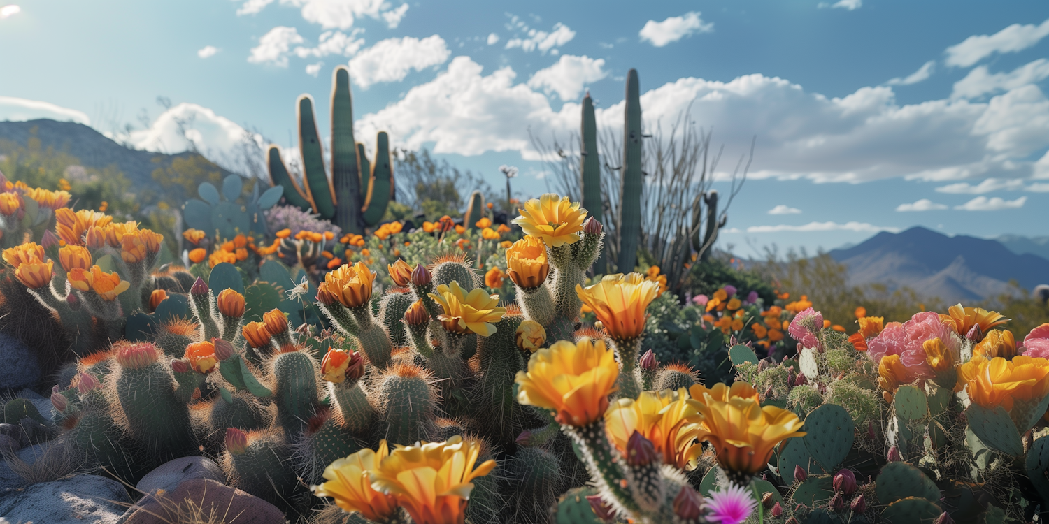 Vibrant desert scene with blooming cacti and colorful flowers under a bright blue sky, set against distant mountains.