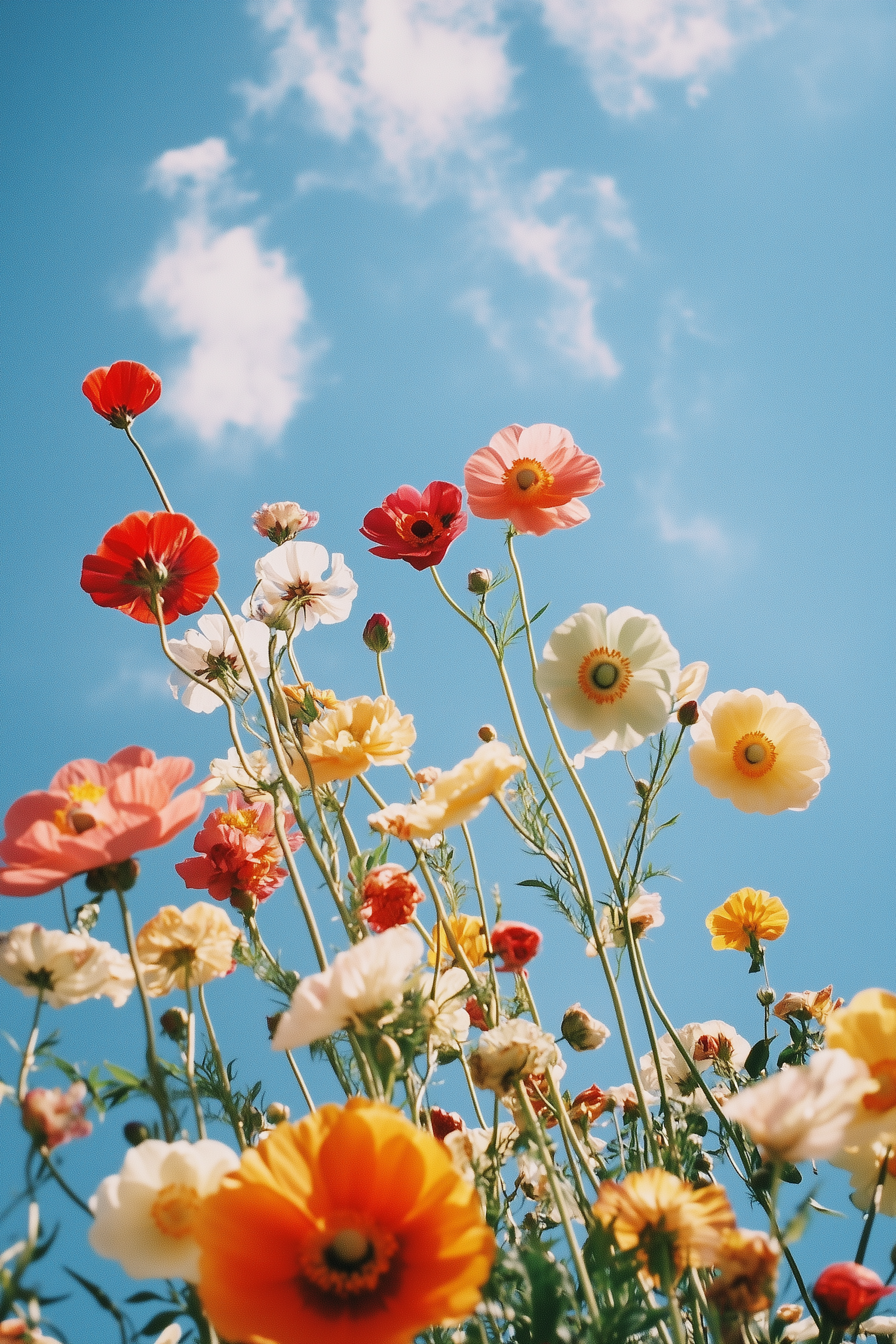 Bright flowers in red, orange, yellow, and white bloom against a clear blue sky with soft clouds, creating a cheerful and vibrant scene.