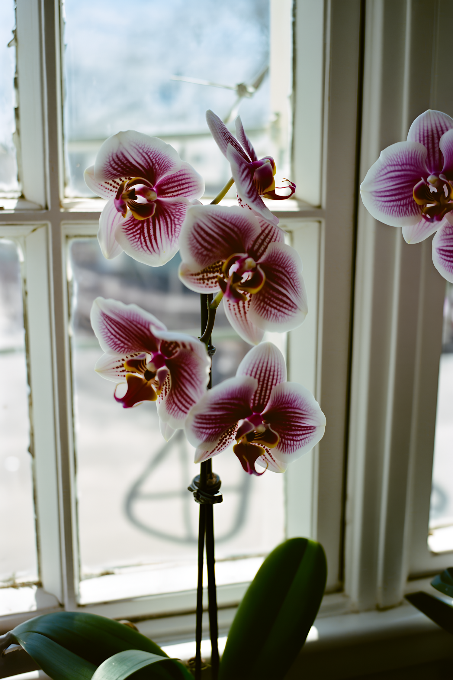 Beautiful purple and white orchid flowers in bloom, set against a softly lit window background, showcasing their intricate patterns.