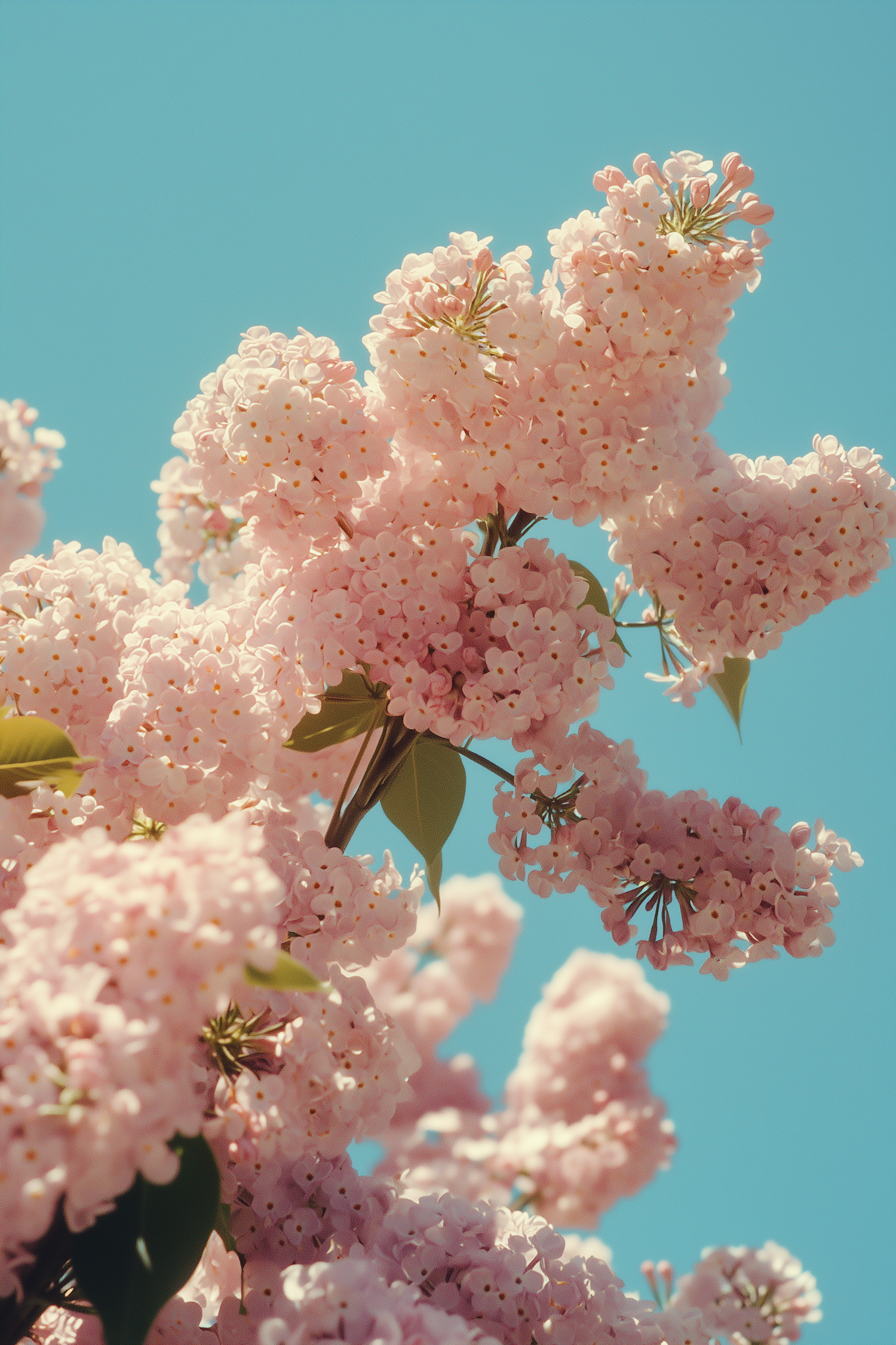 Close-up of pink lilac flowers in full bloom against a bright blue sky, showcasing their delicate petals and vibrant colors.