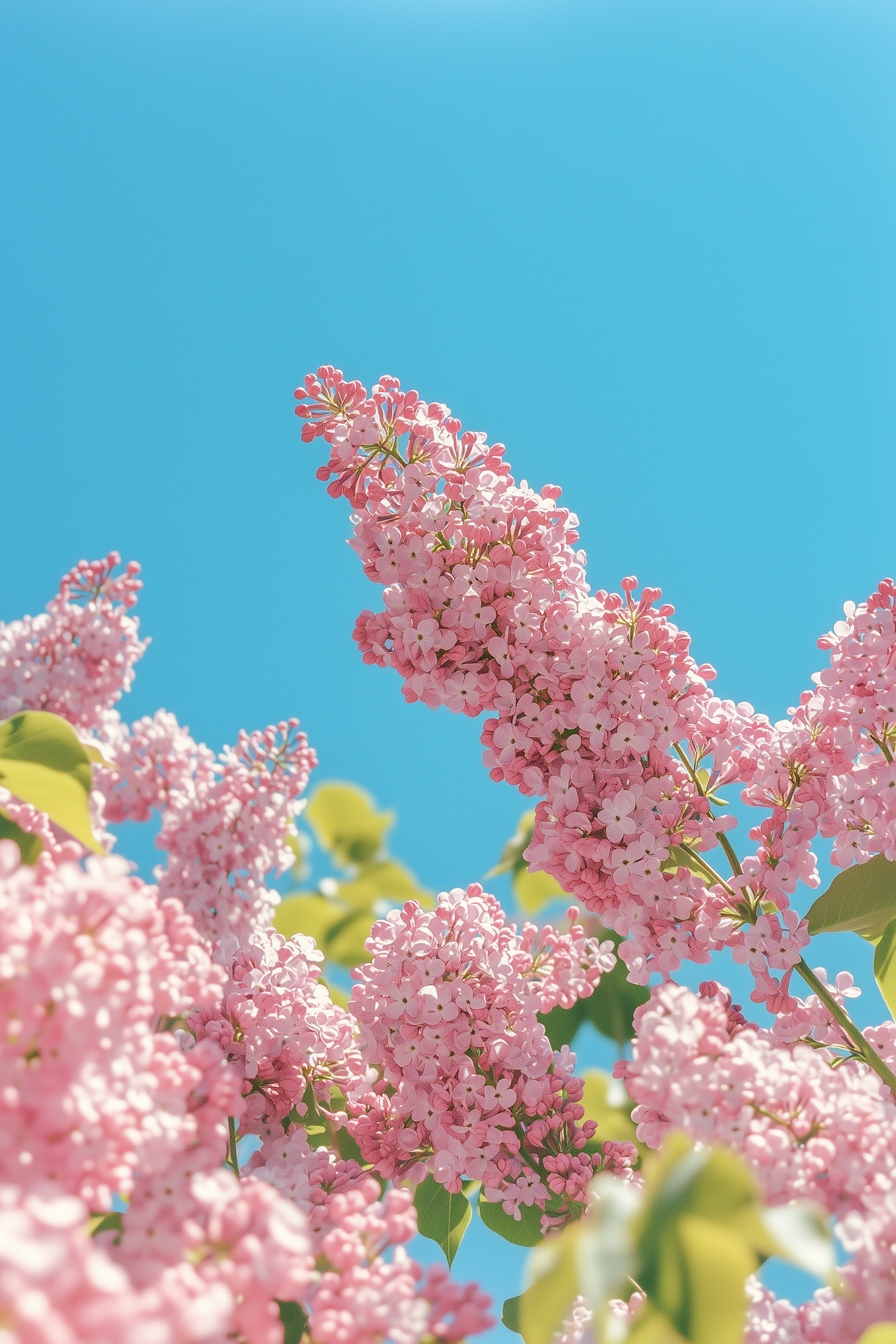 Beautiful pink lilac flowers in full bloom against a bright blue sky, capturing the essence of springtime vibrancy and freshness.