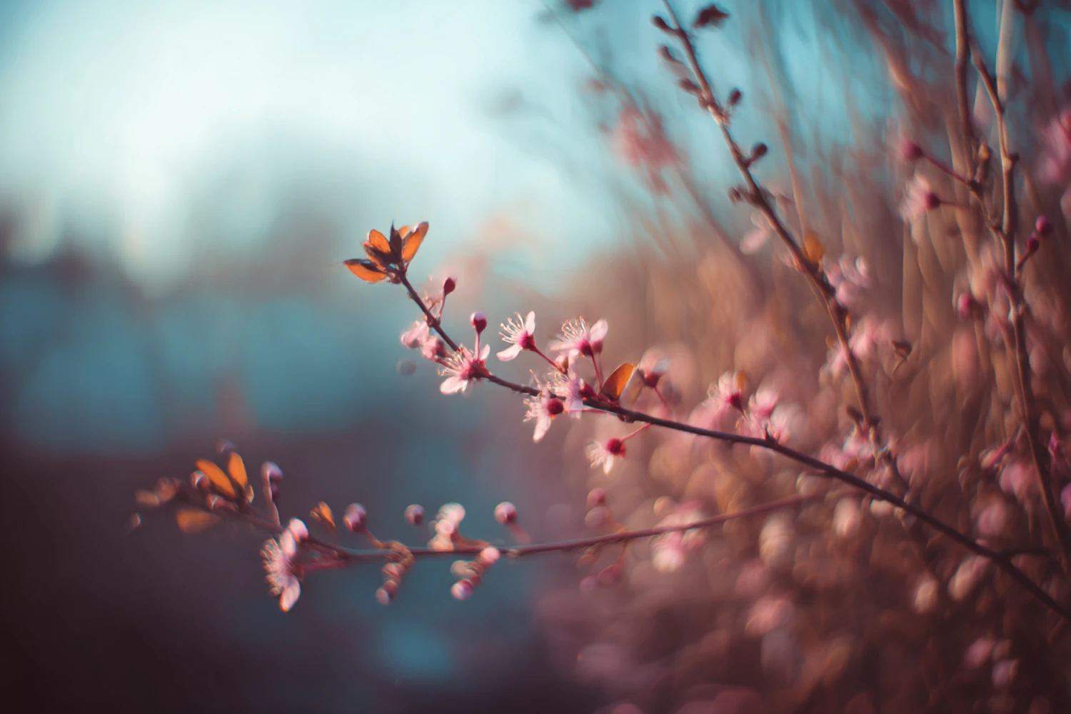A dreamy close-up of a flowering branch with pink blossoms and reddish leaves against a softly blurred background.
