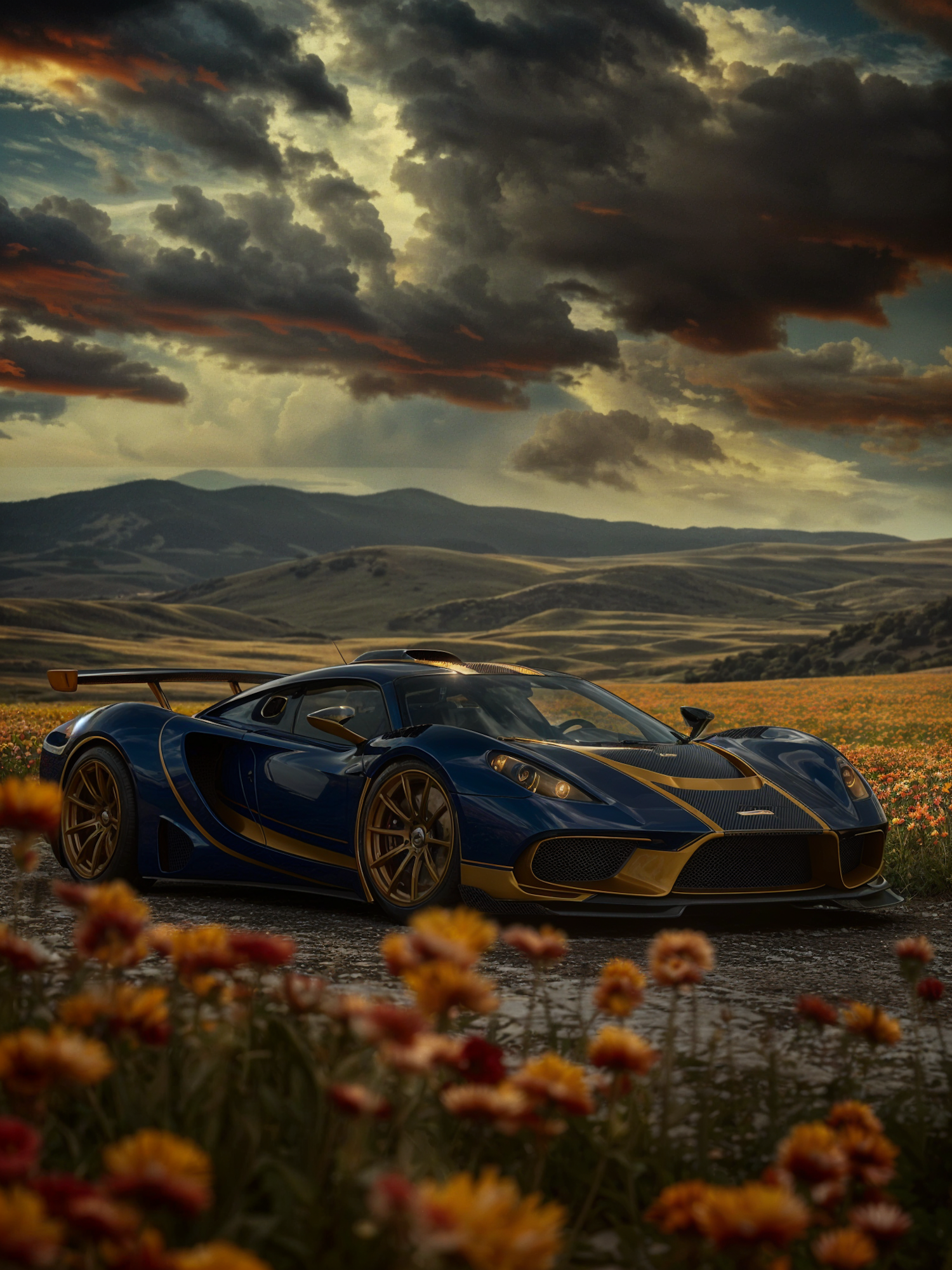 Blue sports car with gold accents in a field of wildflowers under a dramatic sunset sky.