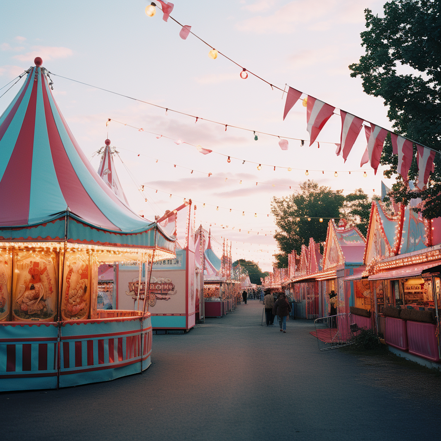 Colorful carnival scene with pink and blue striped tents, festive lights, and bunting flags at dusk.