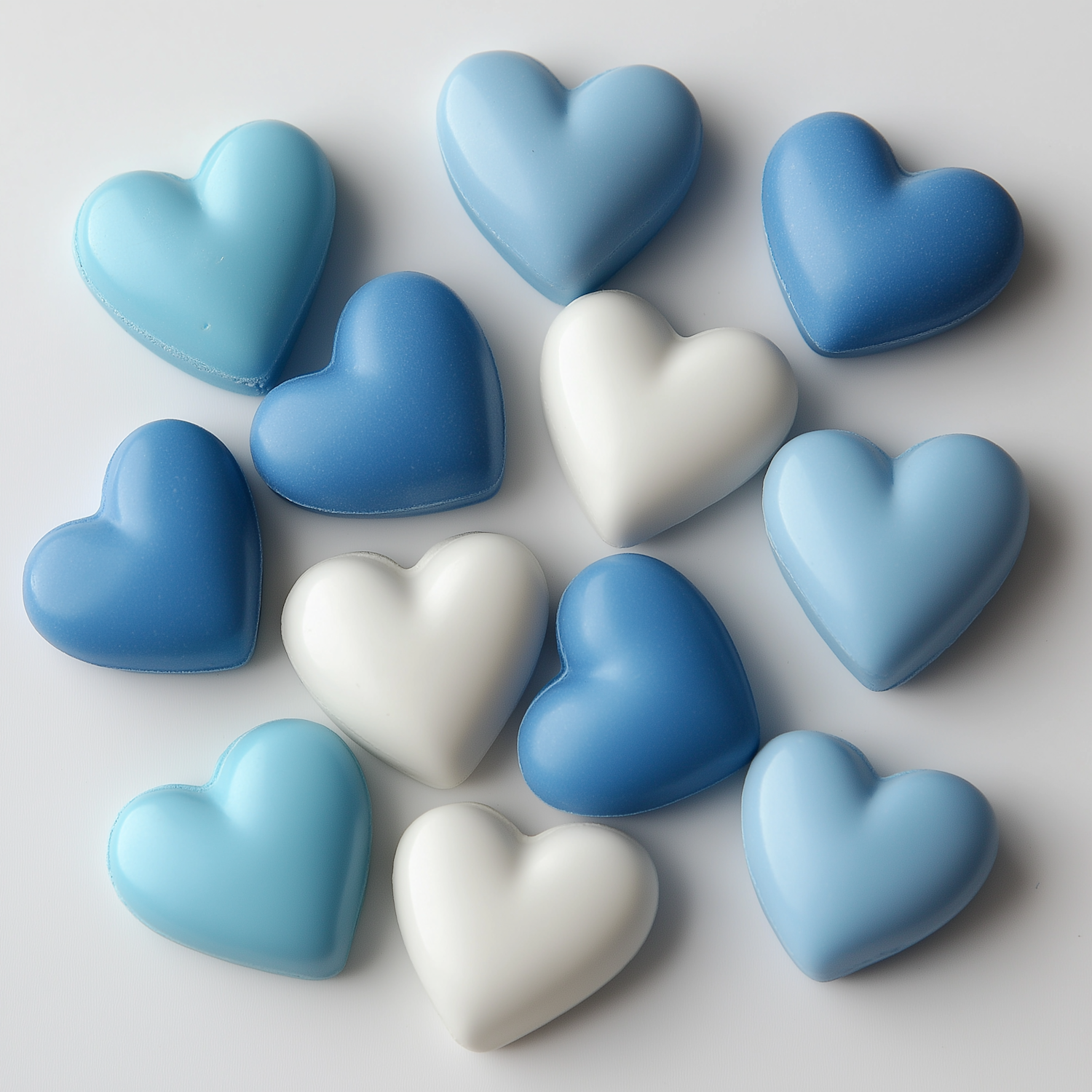 Glossy heart-shaped objects in blue and white shades arranged on a white surface, creating a clean and aesthetic look.