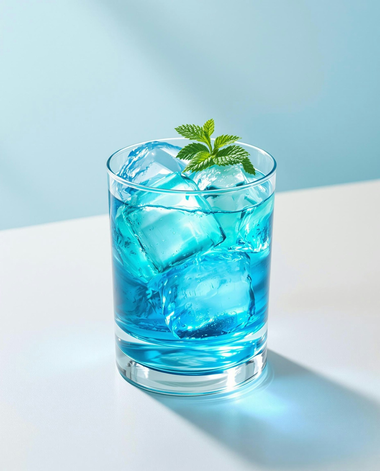A refreshing blue drink with ice cubes and a mint garnish in a clear glass, set against a light blue background.