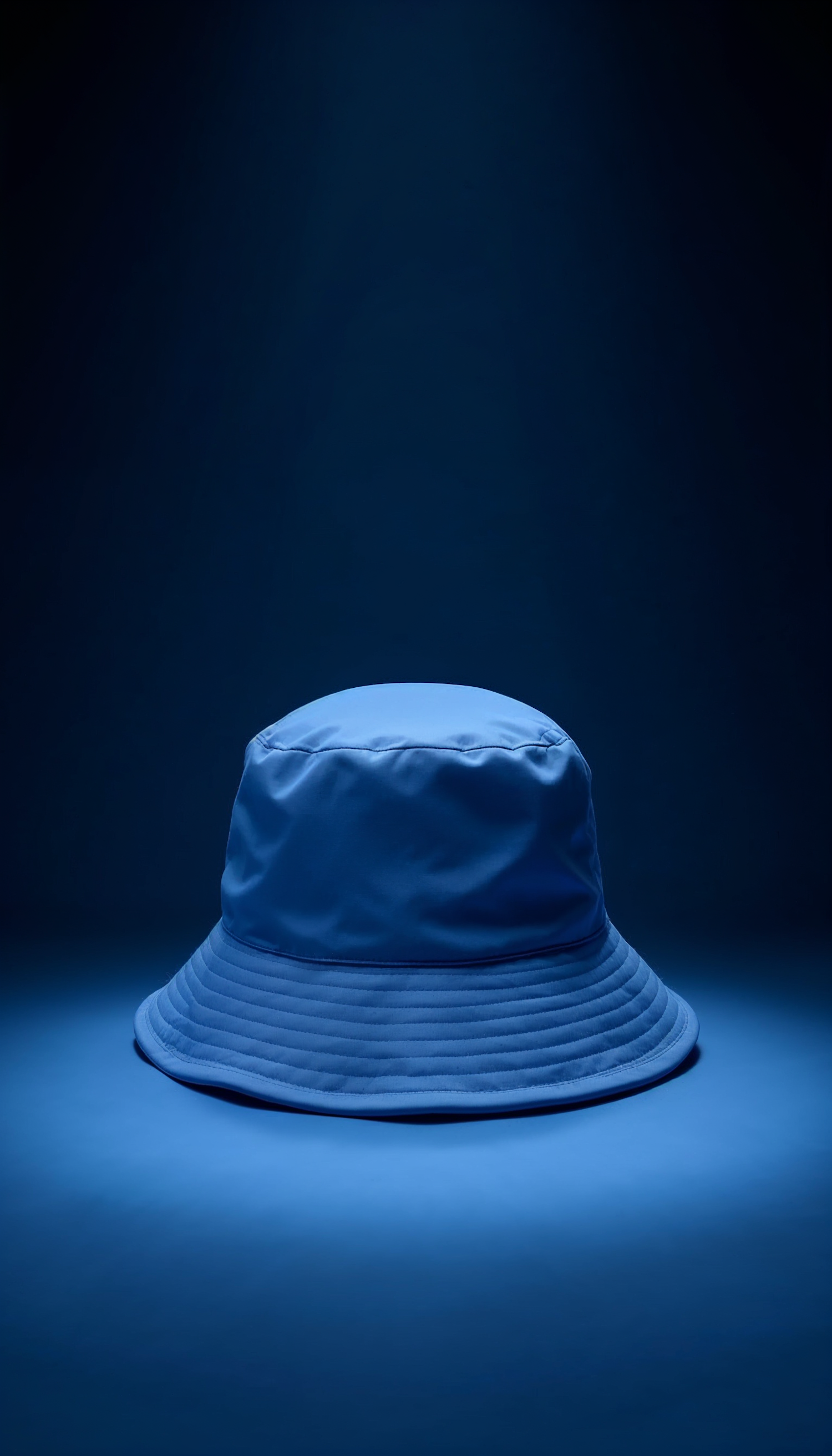 Minimalistic image of a blue bucket hat under spotlight against a dark blue background, highlighting its texture and shape.