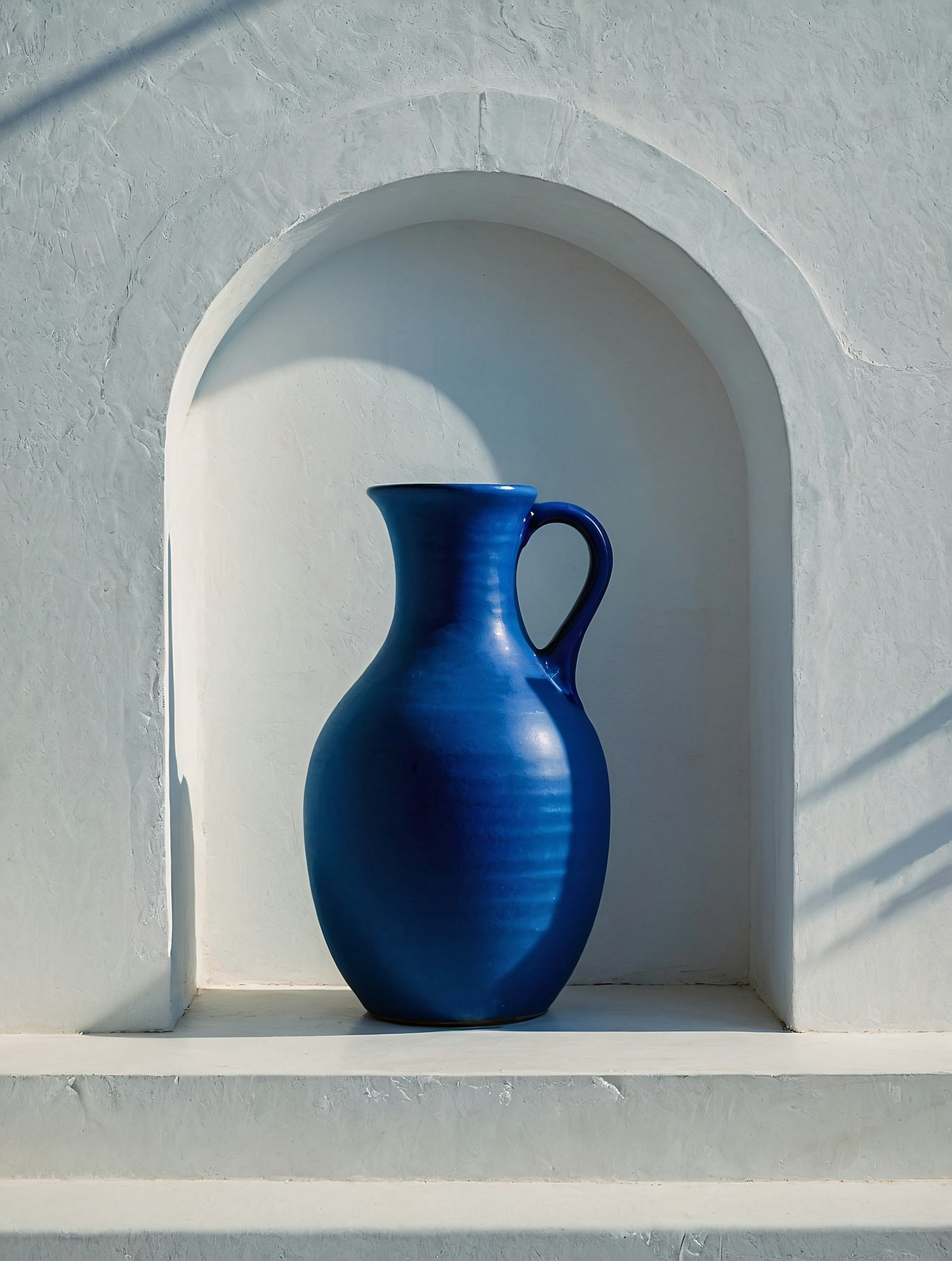 A bold blue ceramic jug in a white arched alcove, bathed in soft natural light, creating a minimalist and Mediterranean-inspired vibe.