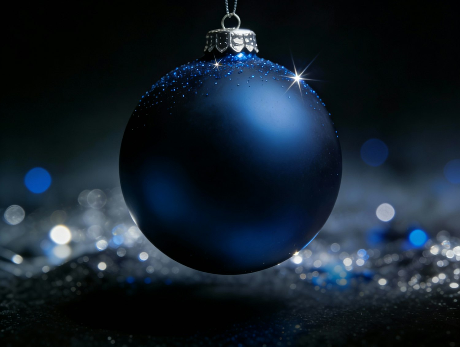 A dark blue Christmas ornament with a silver cap, set against a blurred background with festive bokeh lighting effects.