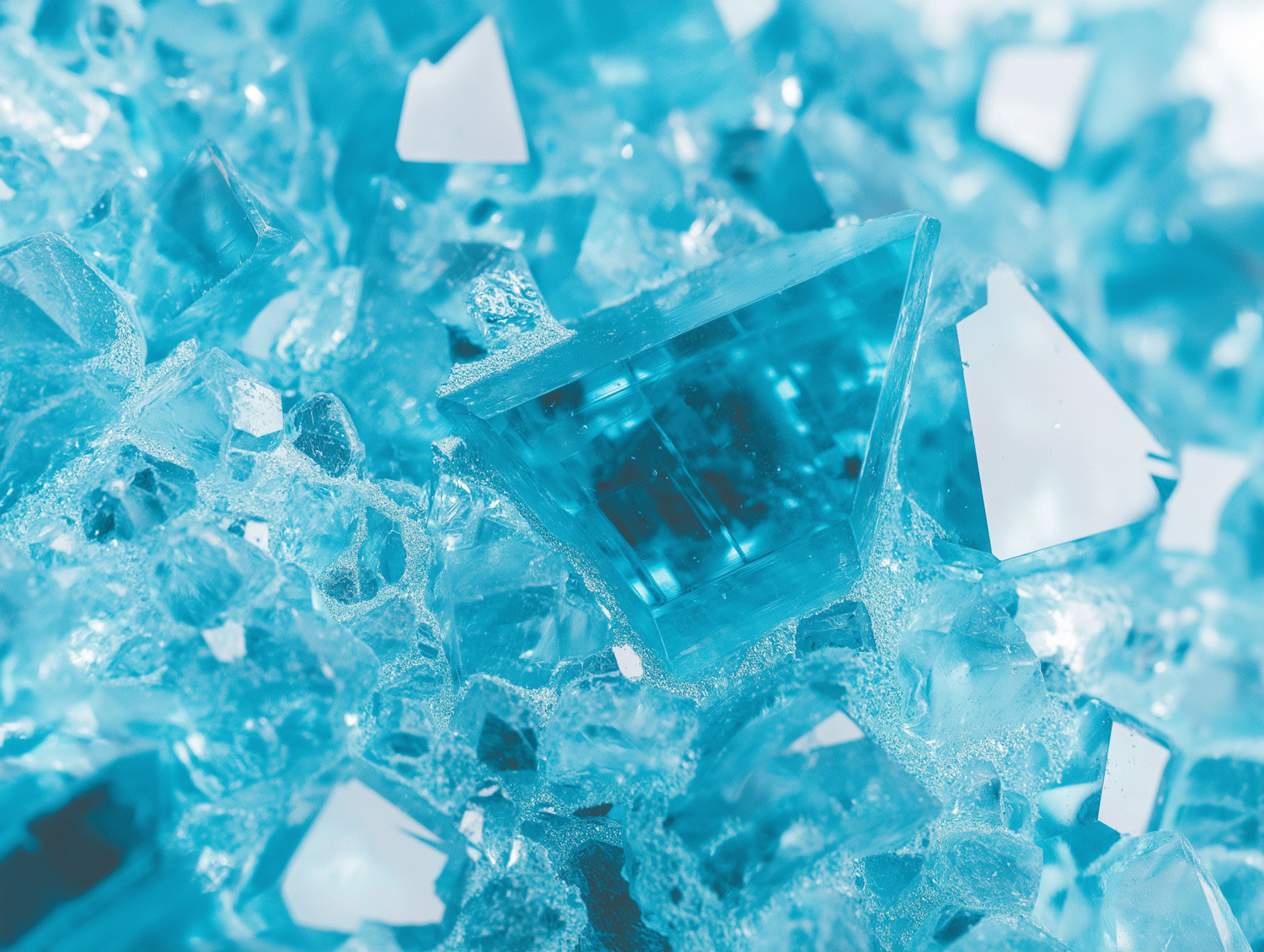Close-up of vibrant blue crystals with intricate geometric shapes, reflecting light beautifully.