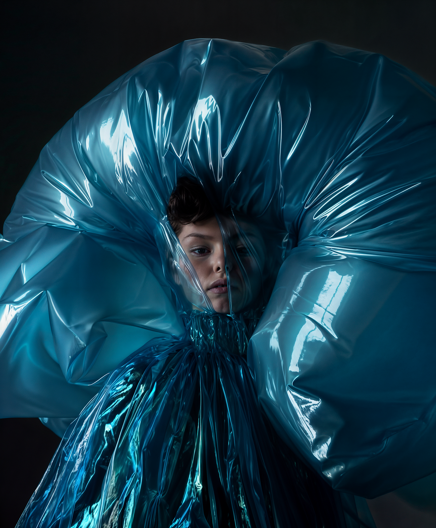 A person in a glossy blue inflatable garment with a futuristic look, partially visible face, and dramatic lighting.