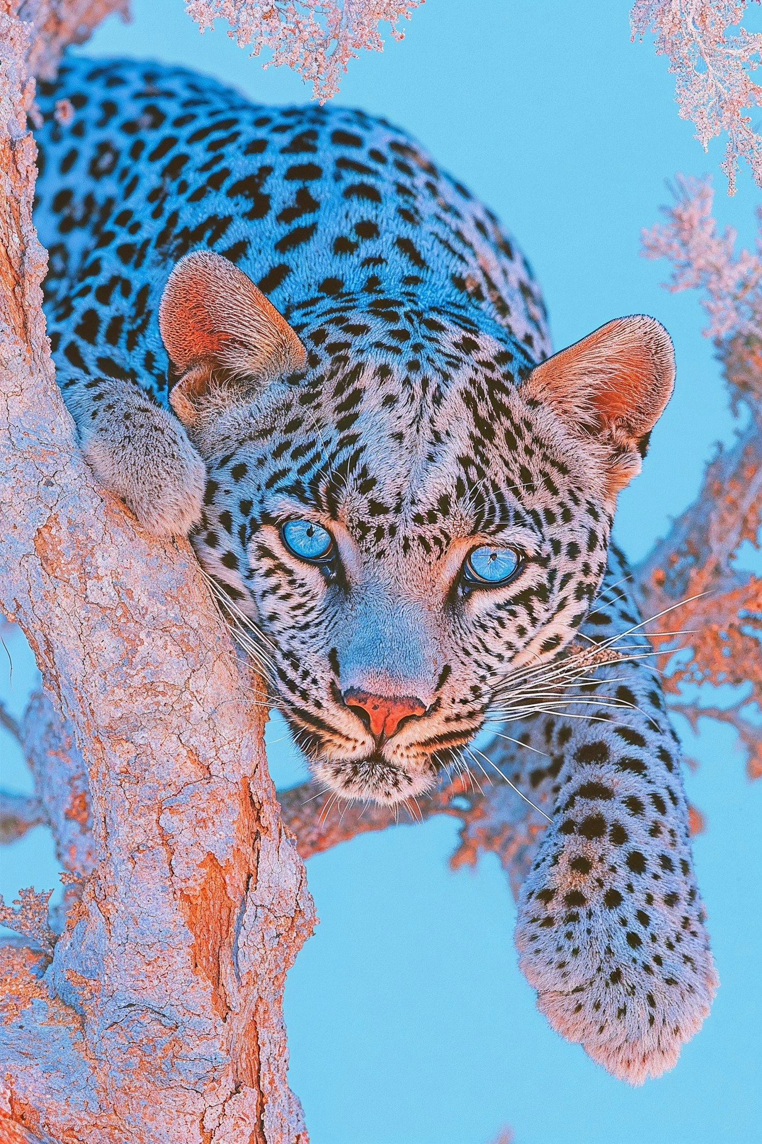 A leopard with striking blue eyes rests on a tree branch against a vivid blue sky, creating a surreal and captivating scene.