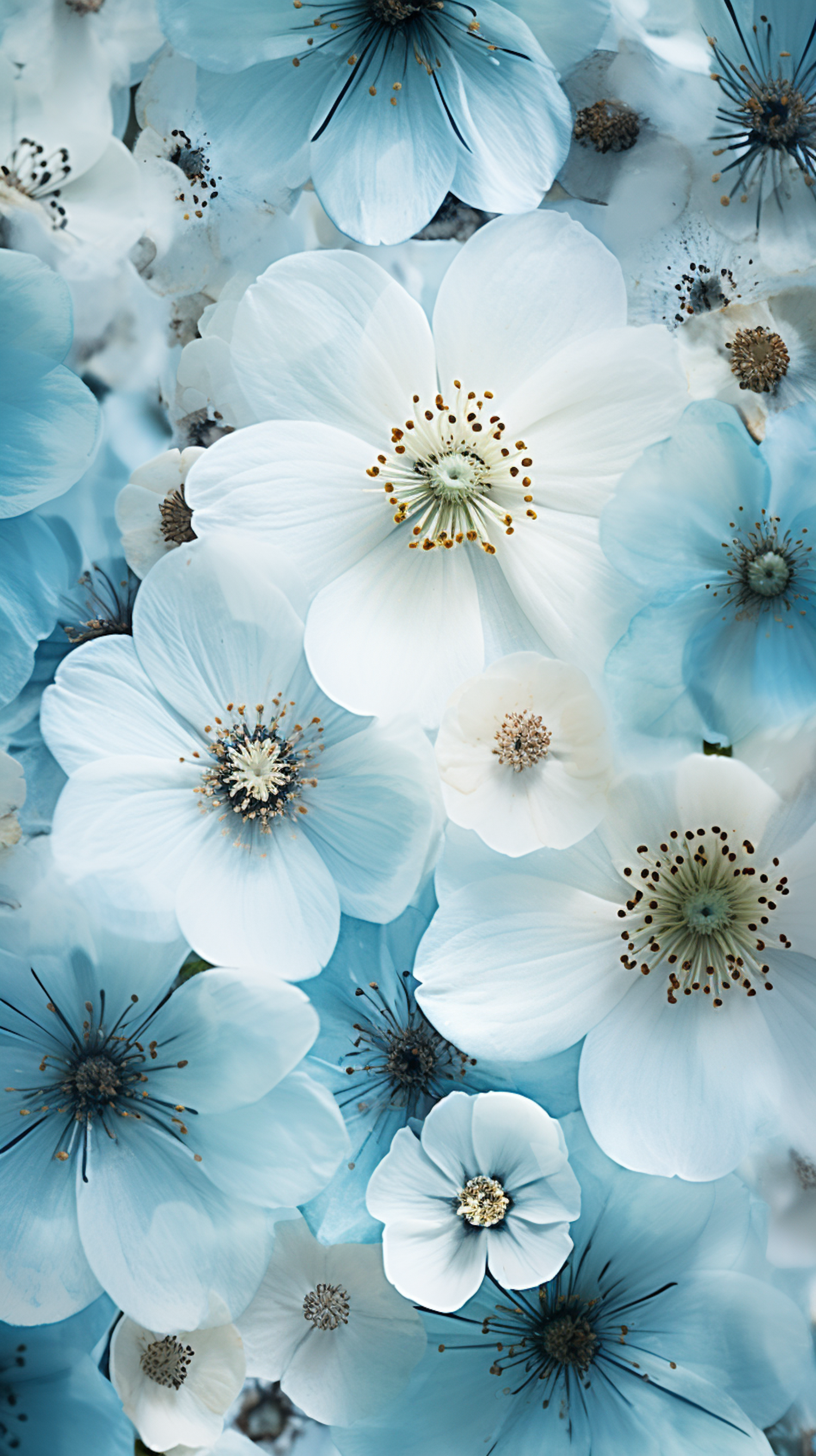 Close-up of delicate white and light blue flowers with intricate petals and stamens, creating a serene and vibrant floral composition.