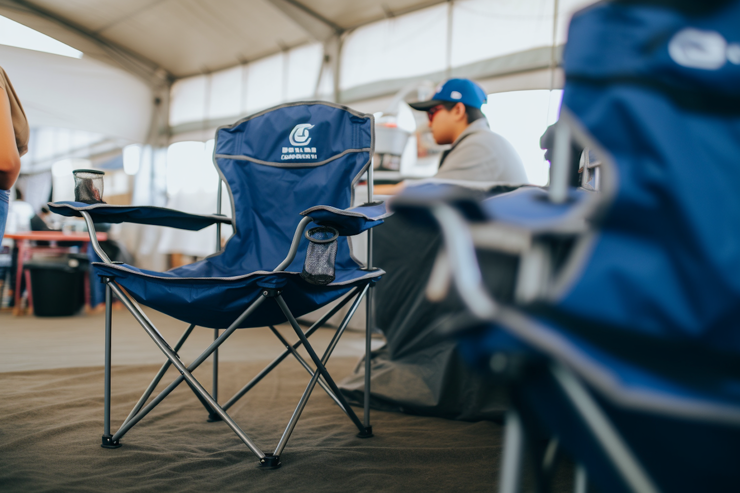 Blue camping chair with cup holder in a tent, person in background wearing blue cap and sunglasses, relaxed setting.