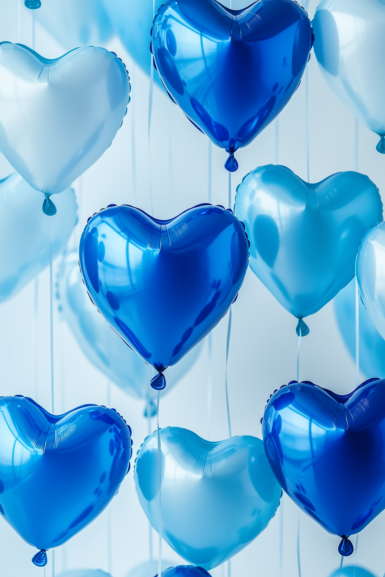 Glossy blue and white heart-shaped balloons floating with strings, creating a vibrant and cheerful atmosphere.