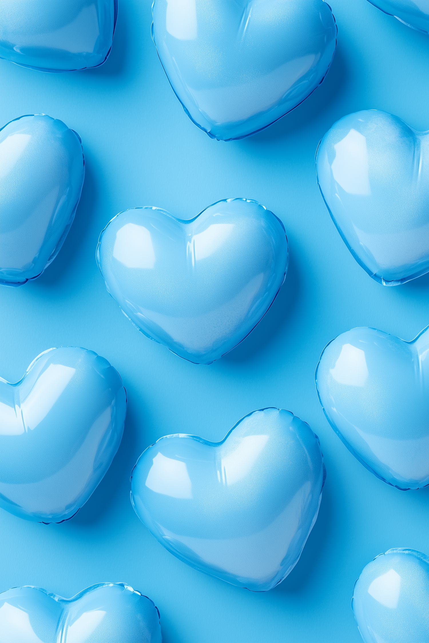 Glossy blue heart-shaped balloons arranged on a matching blue background, creating a playful and vibrant monochromatic pattern.