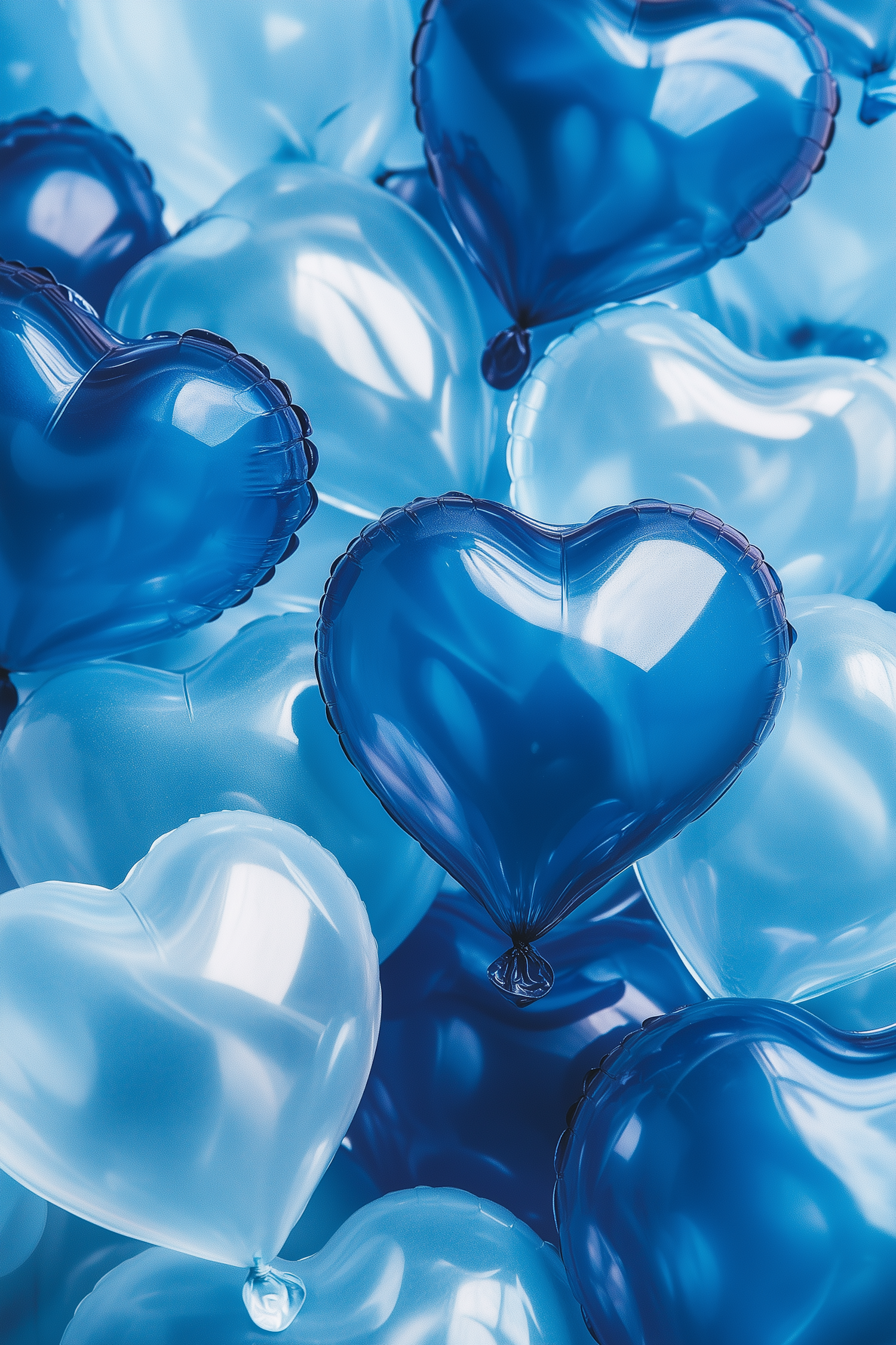 A cluster of shiny, heart-shaped blue balloons in light and dark shades, creating a festive and romantic vibe.