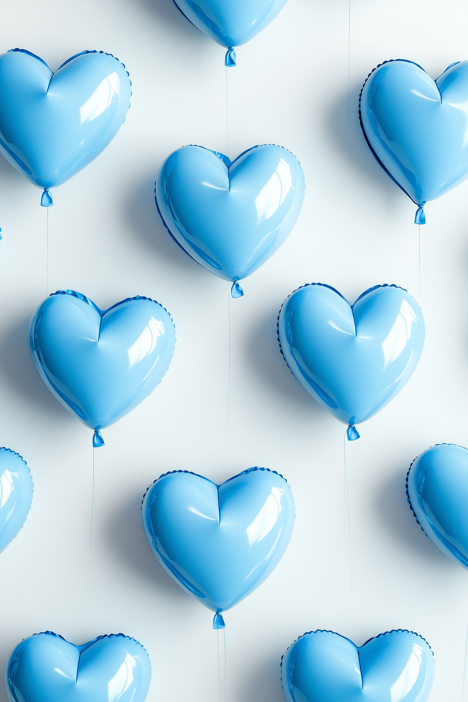 Glossy blue heart-shaped balloons arranged in a symmetrical pattern on a light background, creating a cheerful and festive vibe.
