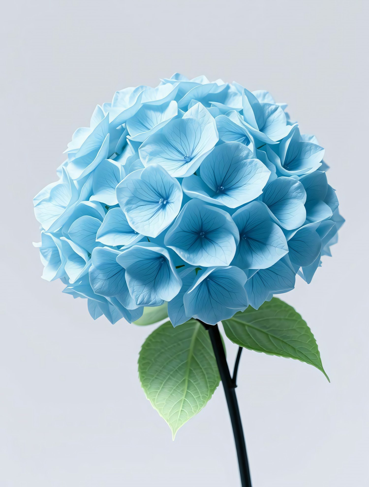 A stunning blue hydrangea bloom with vibrant petals and green leaves, set against a soft gray background for a serene aesthetic.
