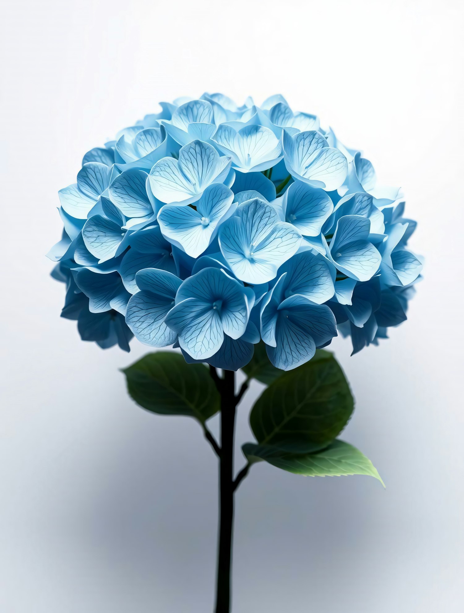 A stunning blue hydrangea flower in full bloom, showcasing intricate petal details and vibrant colors against a clean white background.
