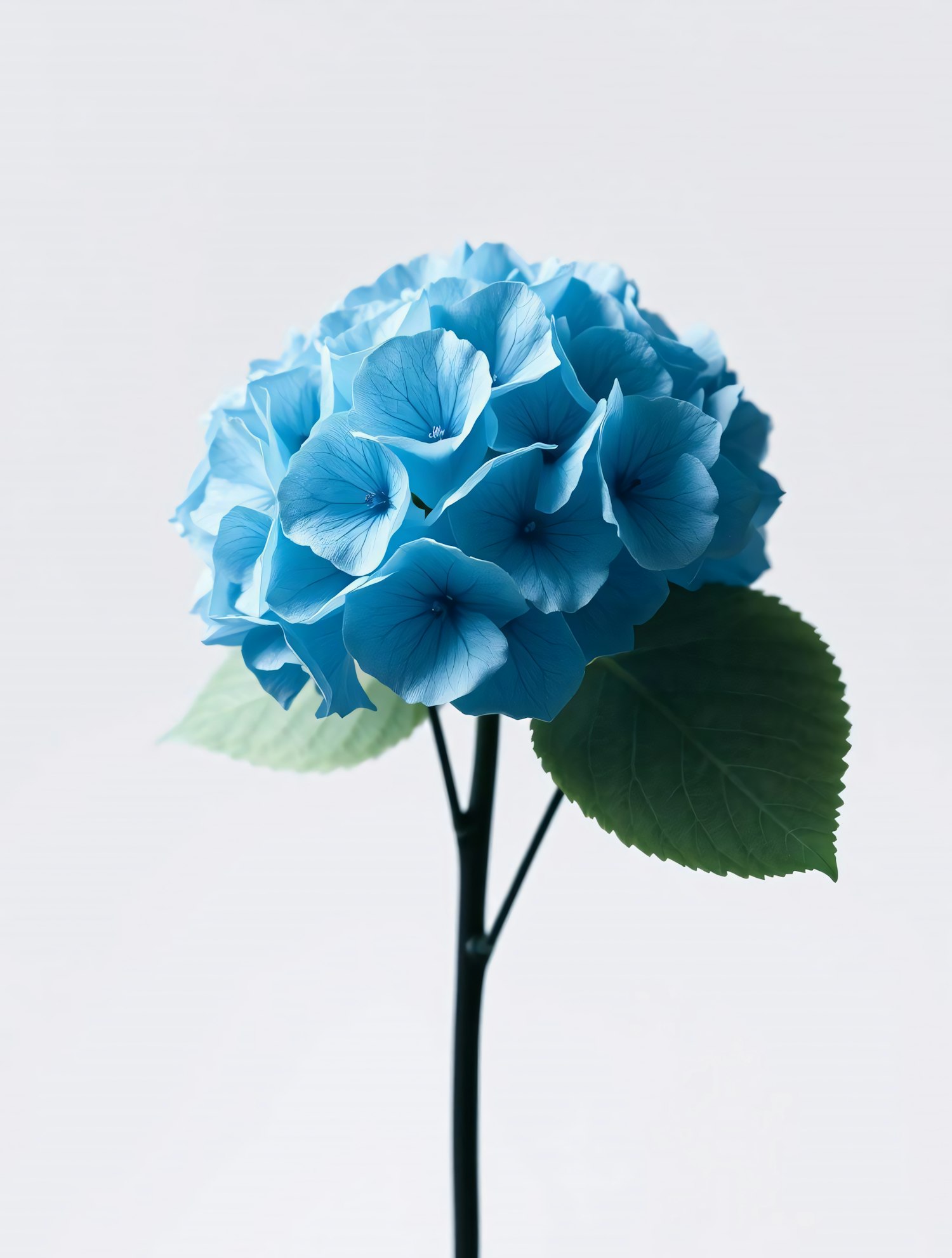 A stunning blue hydrangea bloom with vibrant petals and green leaves, set against a clean white background for a minimalist look.