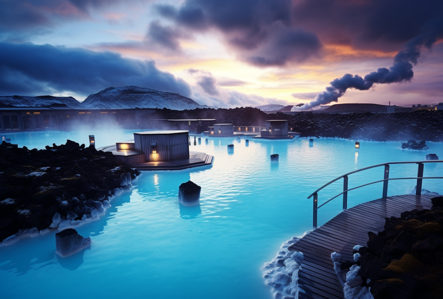 Serene geothermal spa with milky blue waters, volcanic rocks, and modern wooden structures under a dramatic sunset sky.