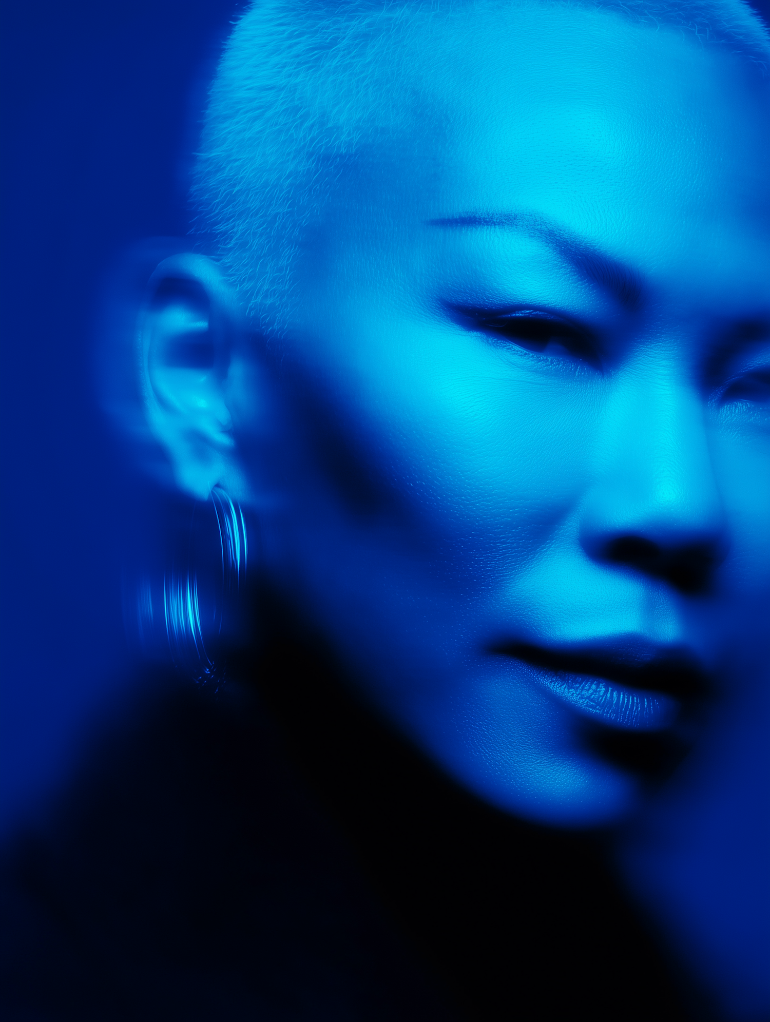 Close-up portrait of a person with a shaved head, illuminated in vibrant blue light, creating a modern and artistic aesthetic.