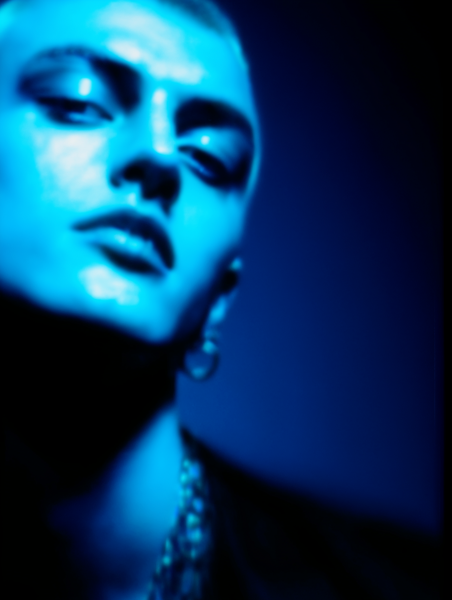 Close-up portrait in dramatic blue lighting, featuring a shaved head, hoop earring, and chain necklace for an edgy, artistic vibe.