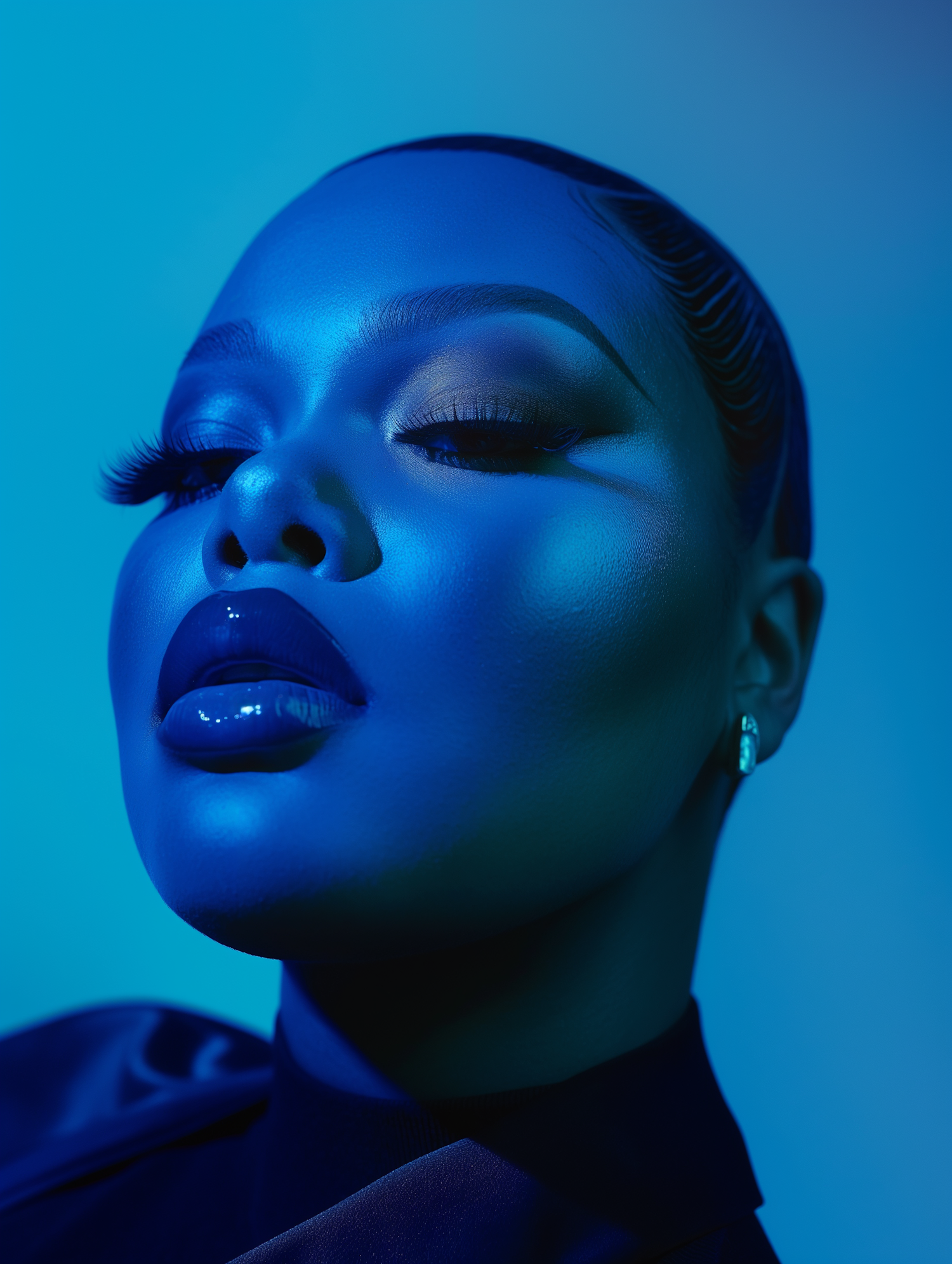 Dramatic blue-lit portrait of a woman with glossy lips and sleek hair, creating a futuristic and artistic aesthetic.