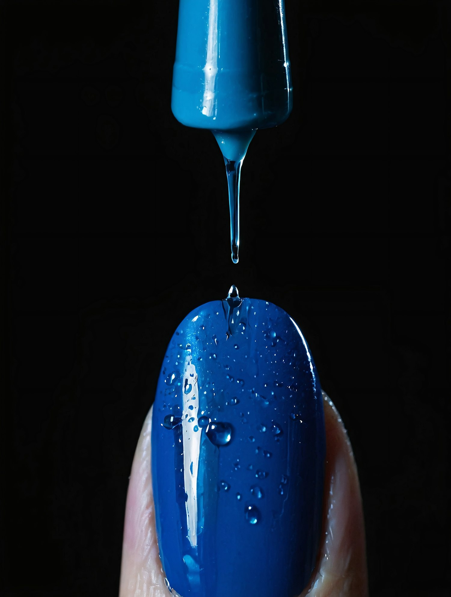 Close-up of a fingernail being painted with glossy blue nail polish, with a drop suspended from the applicator brush.