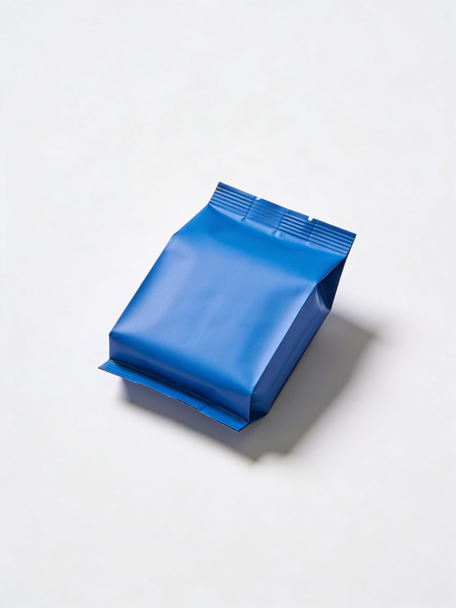 A vibrant blue sealed package on a light background, showcasing its smooth and reflective surface with subtle creases.