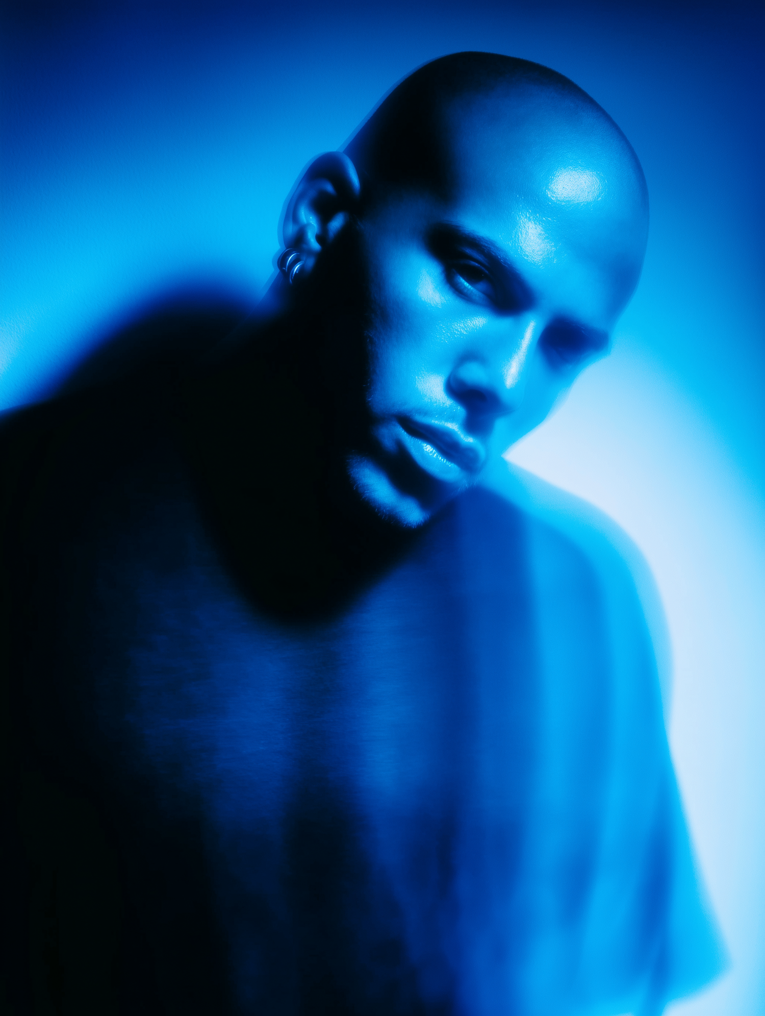 Moody portrait of a bald man in blue lighting, with a blurred effect adding a dreamlike, artistic touch.
