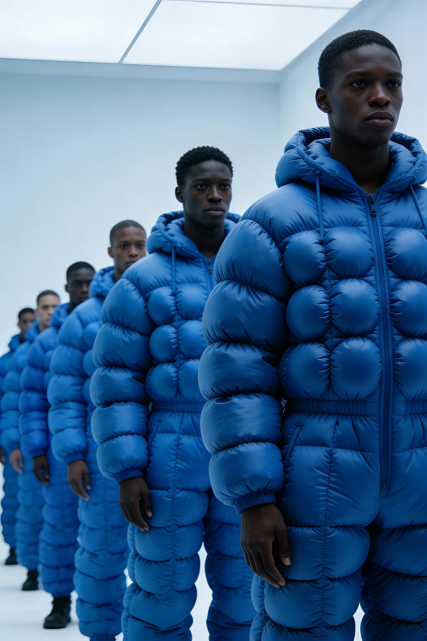 A line of individuals in vibrant blue quilted outfits in a minimalistic white setting, showcasing unique fashion design.