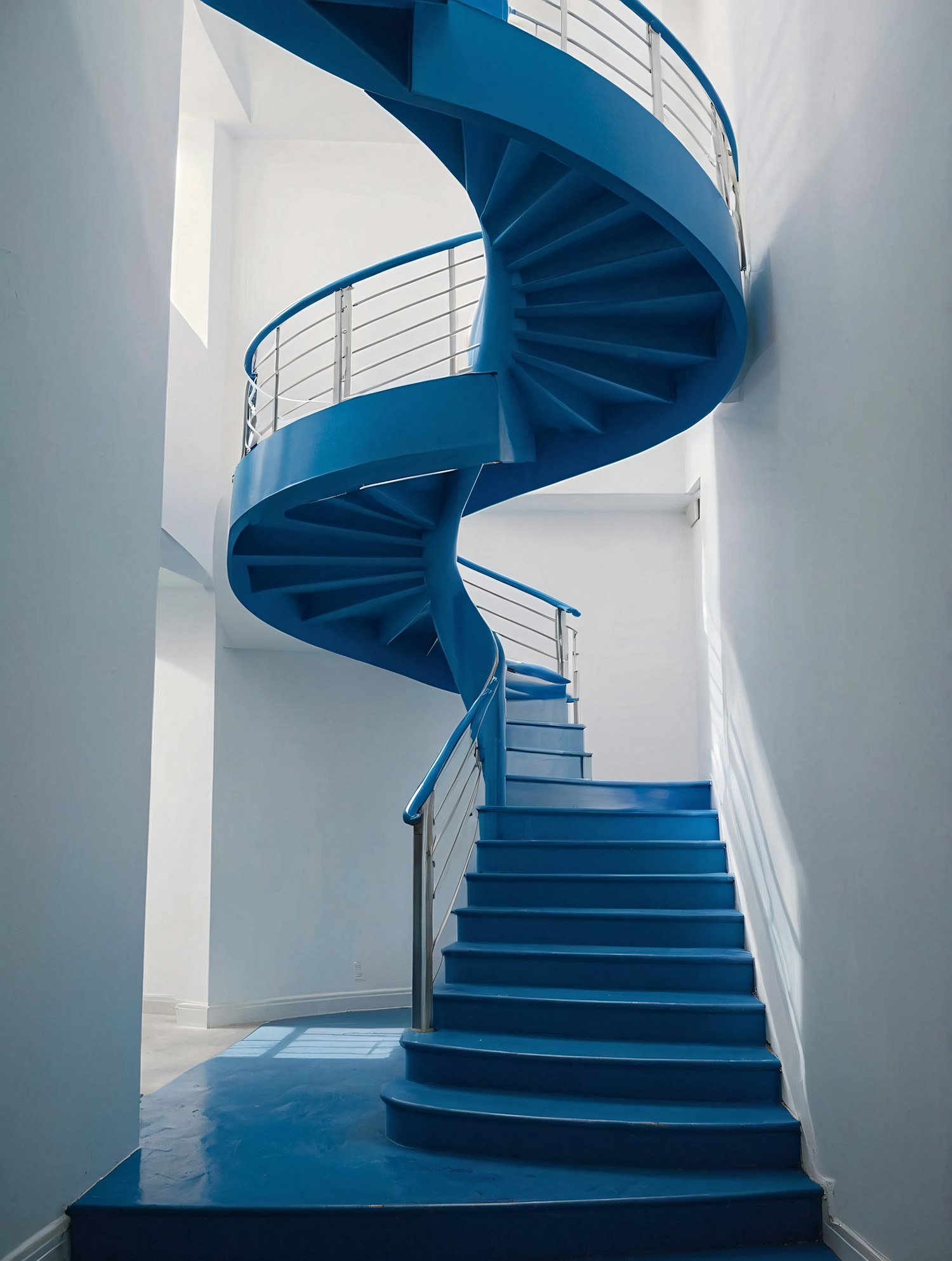 Bright blue spiral staircase with sleek metal railings in a minimalist white interior, illuminated by natural light.