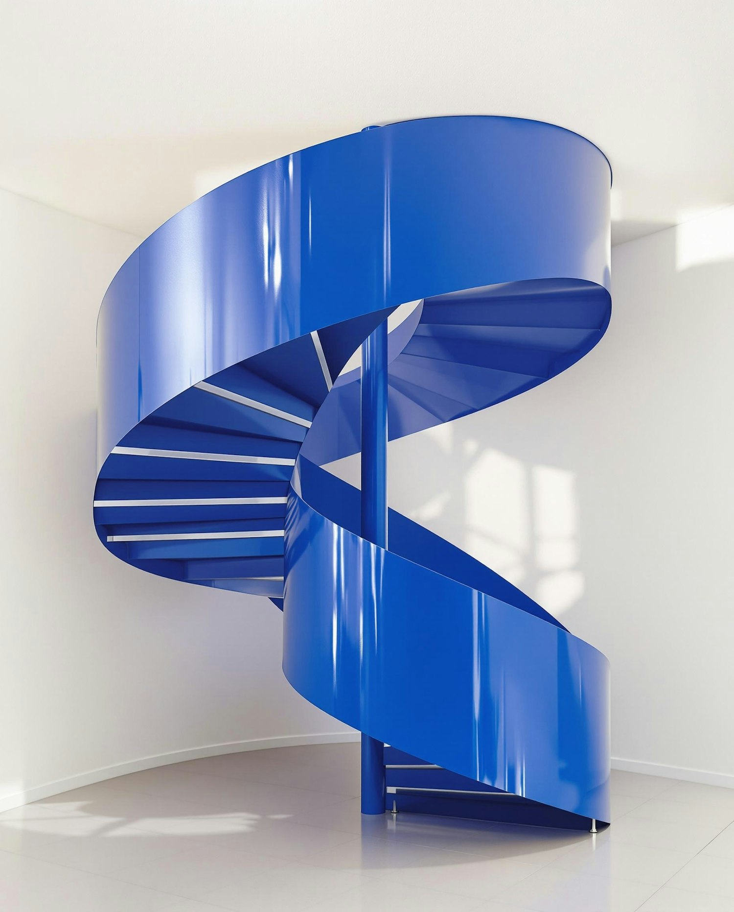 A bold cobalt blue spiral staircase in a high-ceiling room, modern architectural design, smooth texture, high contrast lighting, minimal background with off-white walls and soft shadows, editorial style shot.