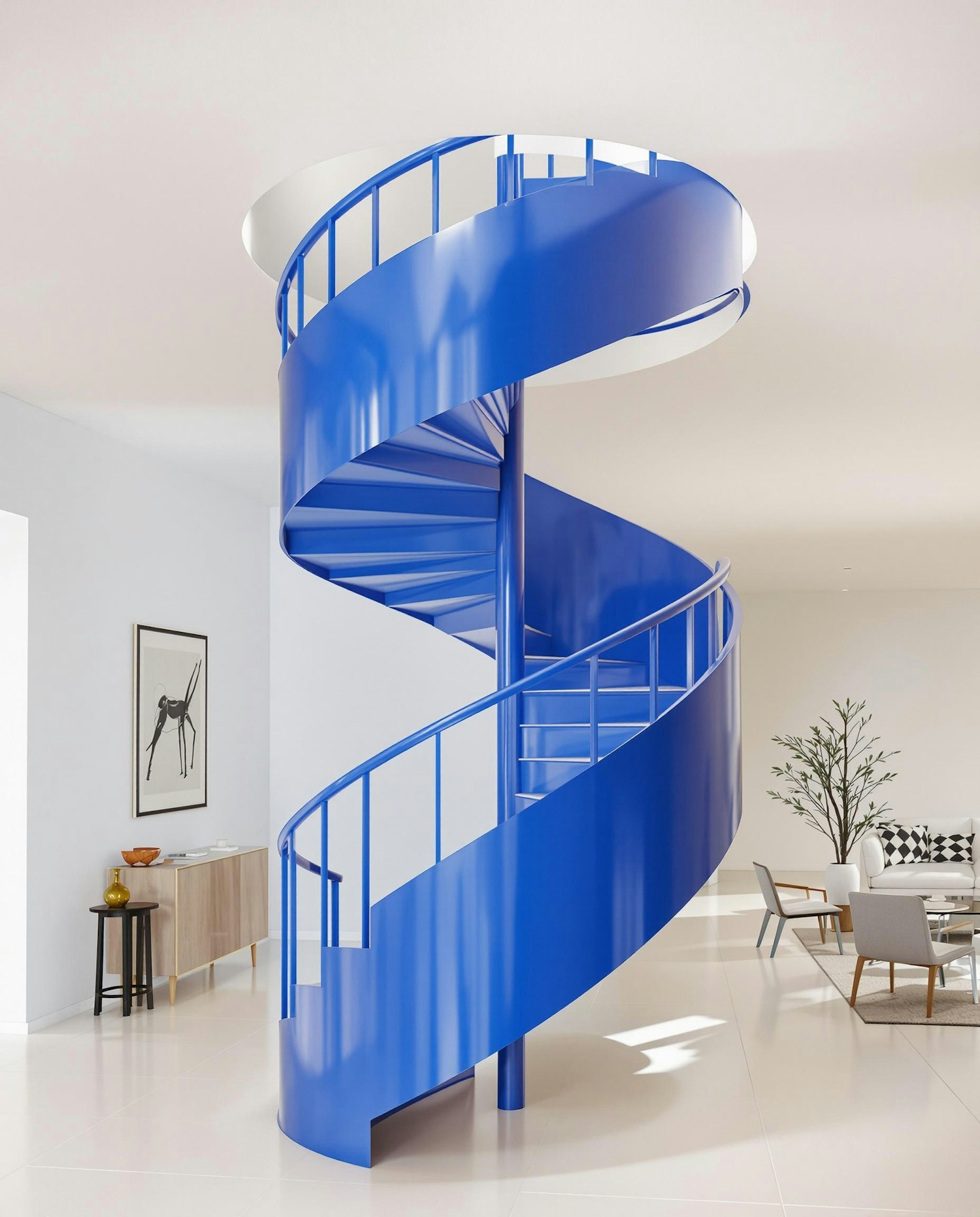 Vibrant blue spiral staircase in a modern, minimalist living room with white walls, polished floors, and stylish contemporary furniture.