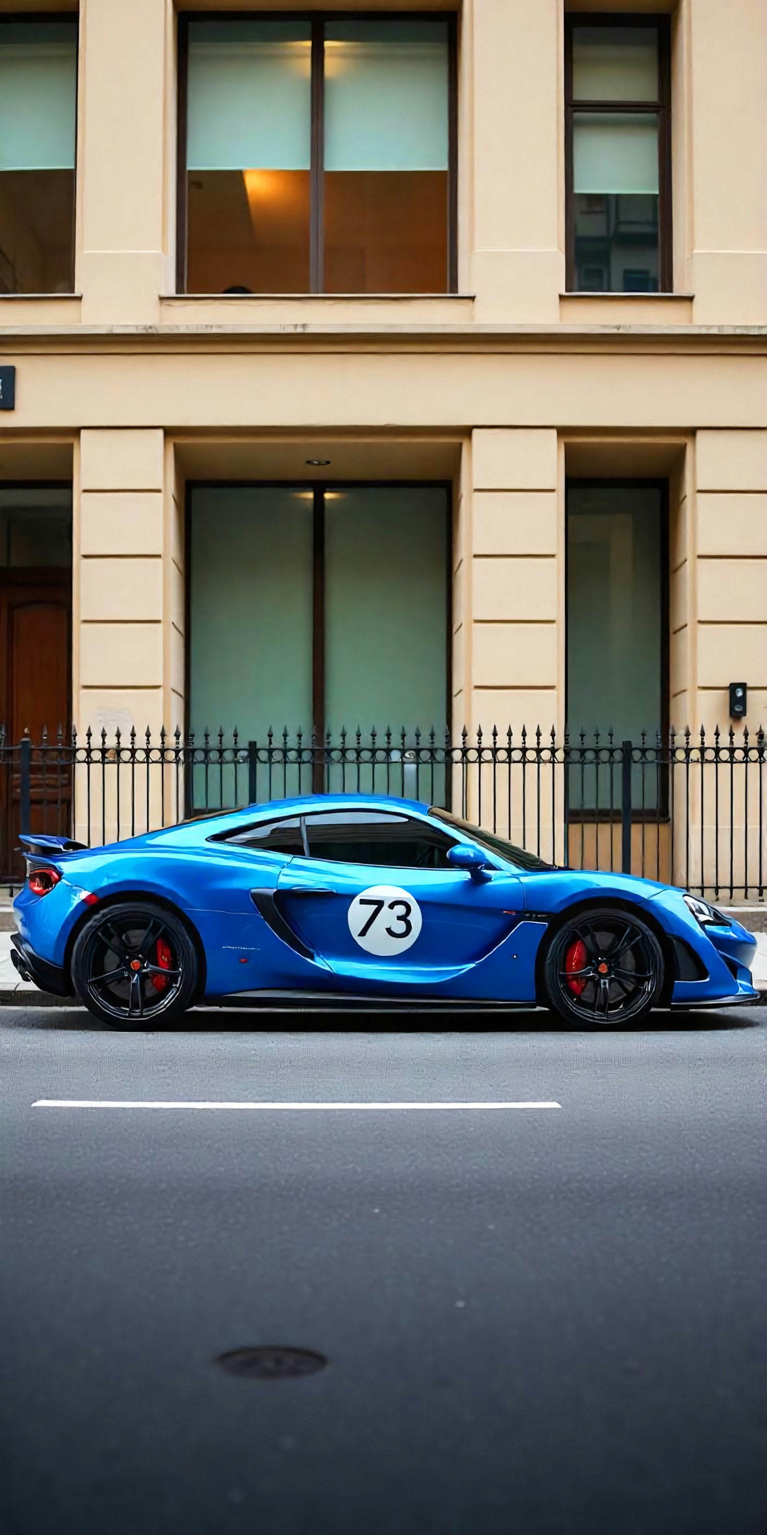 Sleek blue sports car with racing number '73' parked in front of a beige building.
