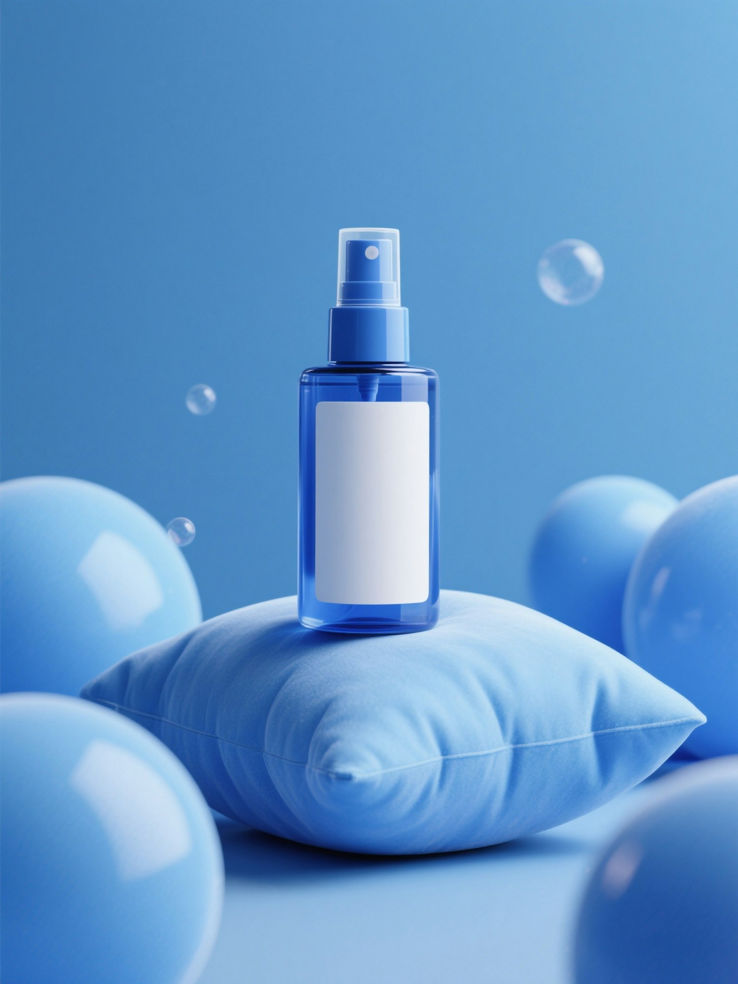 A sleek blue spray bottle with a blank label sits on a soft blue pillow, surrounded by glossy spheres and bubbles in a serene blue setting.