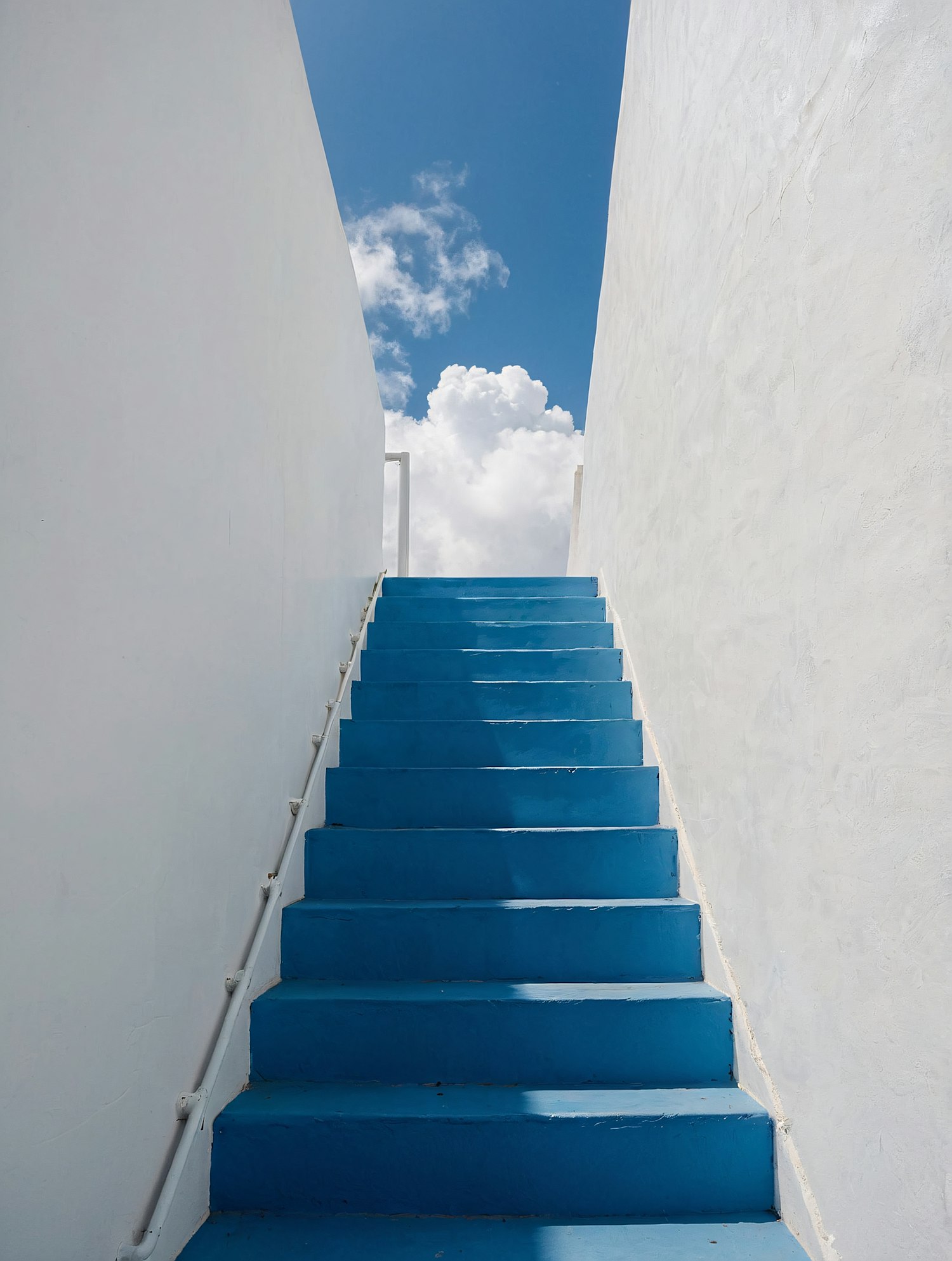Bright blue stairs between white walls lead to a clear sky with fluffy clouds, creating a serene and minimalist aesthetic.