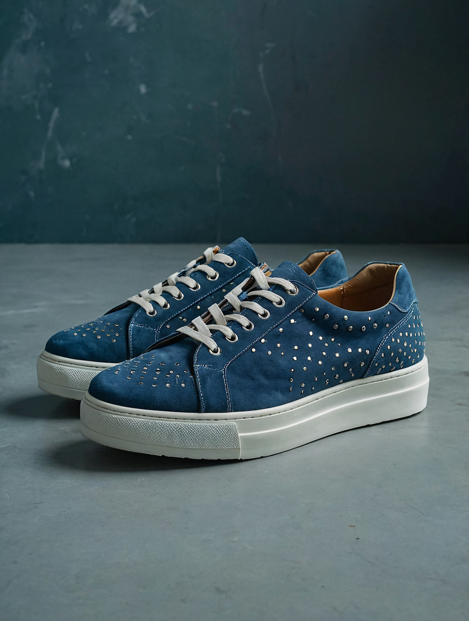 Blue suede sneakers with metallic studs, white laces, and a thick white sole, set against a minimalist concrete and green backdrop.