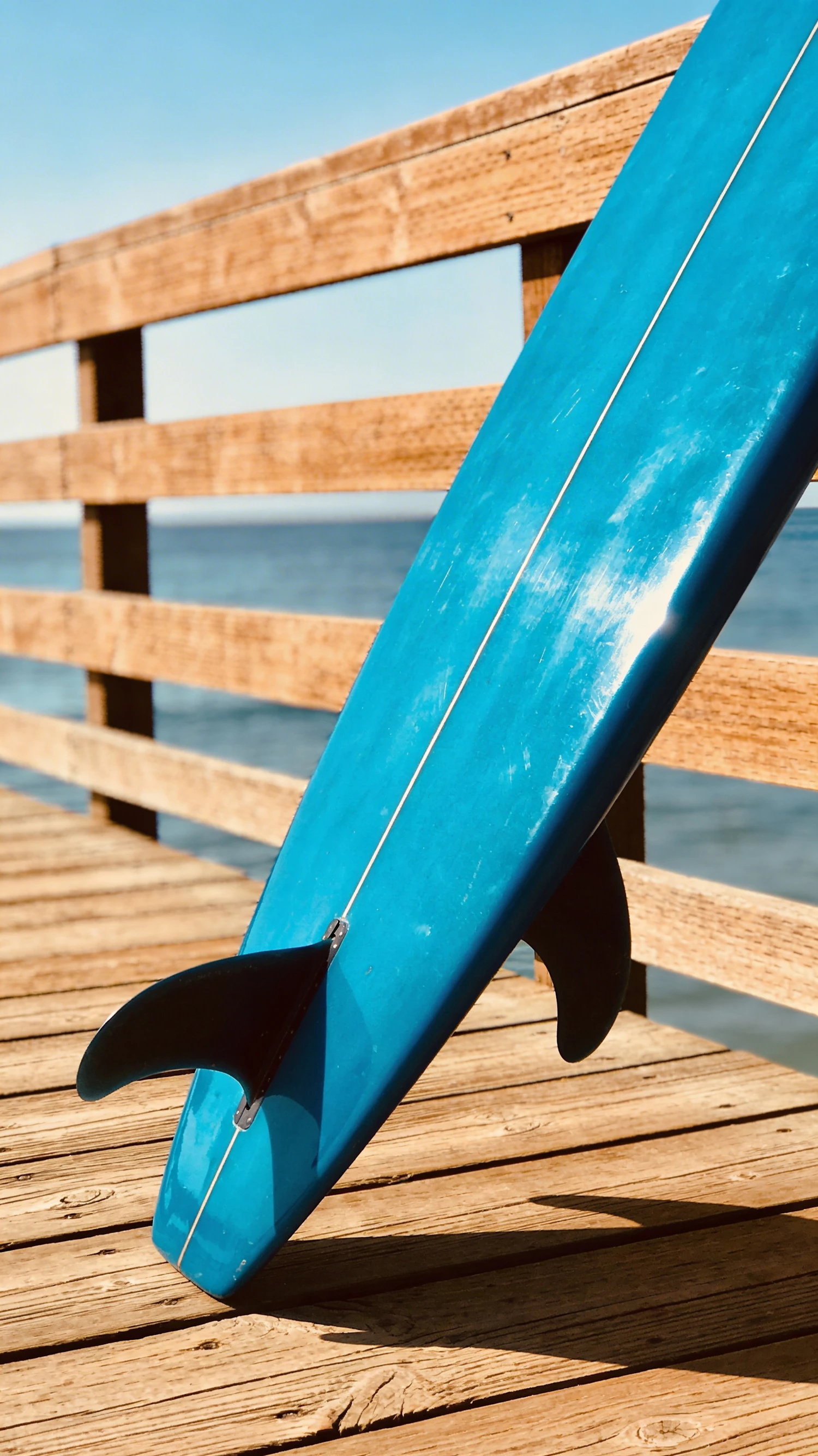 A blue surfboard with a black fin leans against a wooden pier railing, with the ocean and sky in the background.