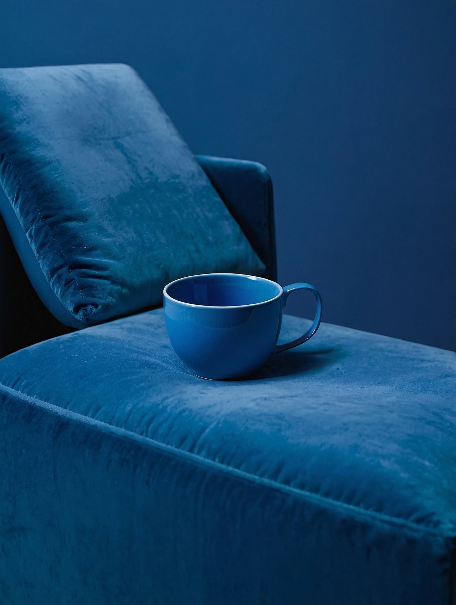 A cozy blue velvet chair with a matching cushion and a glossy blue mug, set against a solid blue background for a serene vibe.