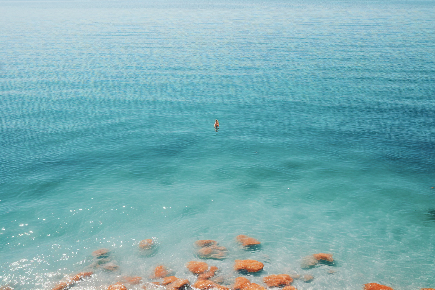 A lone figure stands in calm turquoise waters, surrounded by orange-brown rocks under a clear sky, evoking tranquility and solitude.
