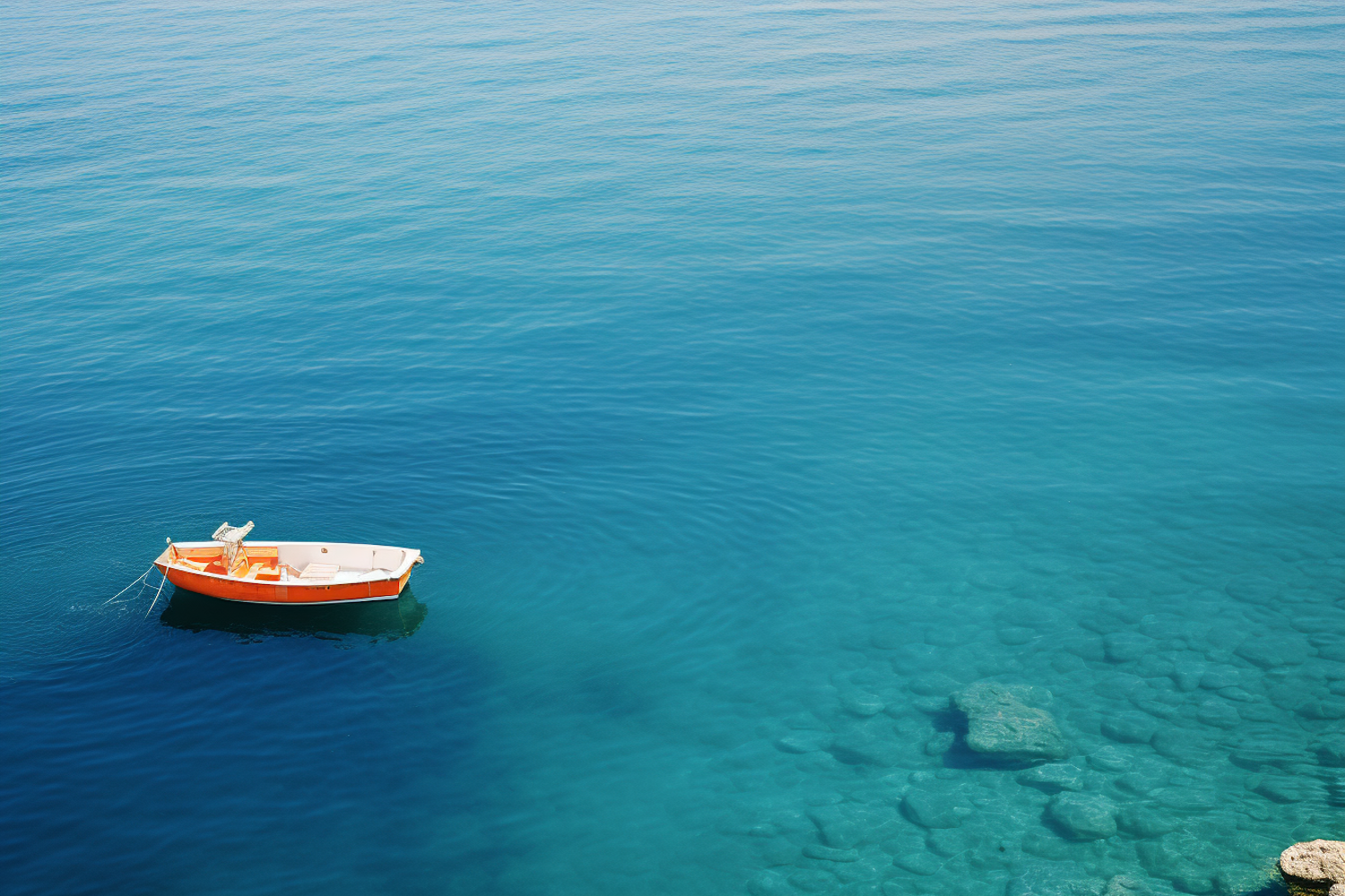 Vibrant orange boat on clear turquoise water with visible rocky seabed, creating a serene and tranquil scene.