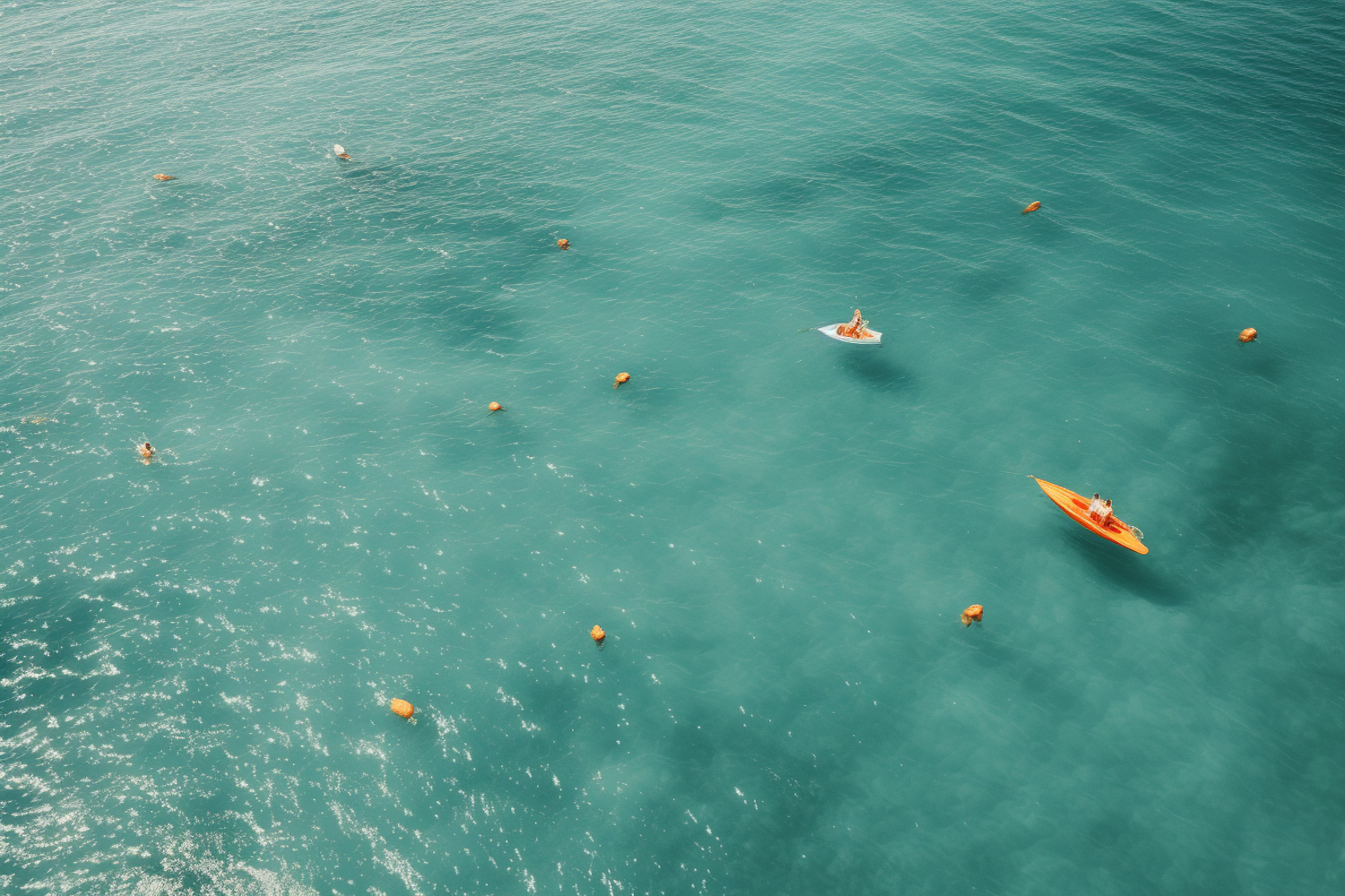 Aerial view of turquoise ocean with swimmers, kayakers, and buoys. Sunlight shimmers on the water, creating a serene scene.