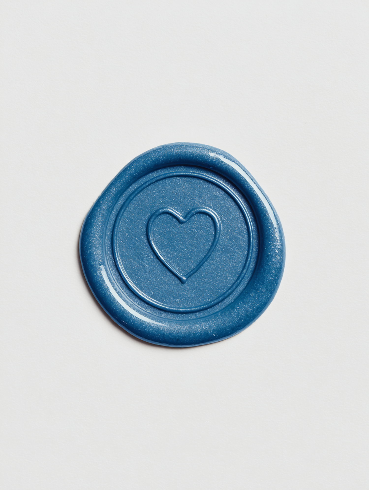 A blue wax seal with a heart design on a white background, showcasing a glossy and handcrafted appearance.